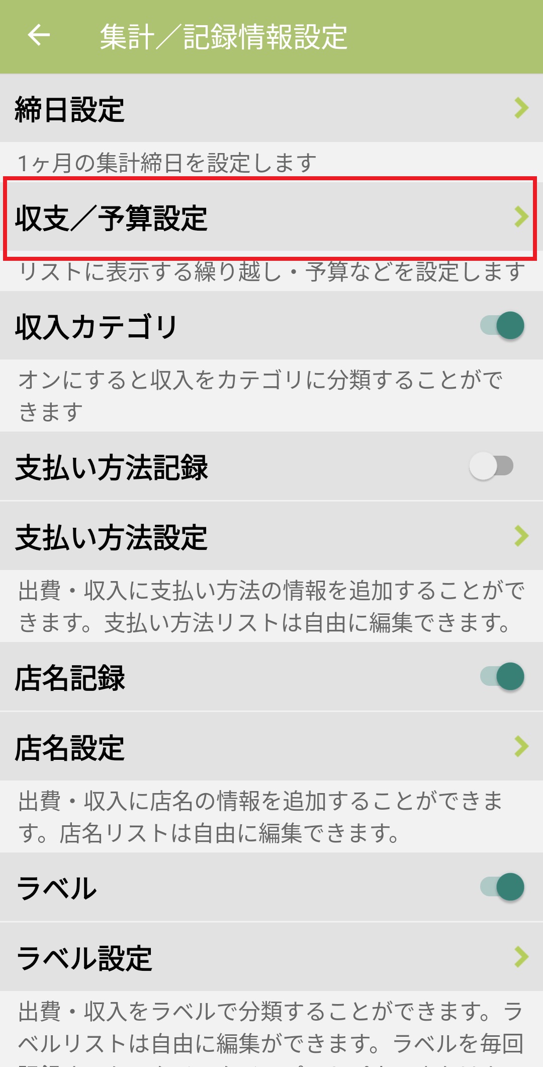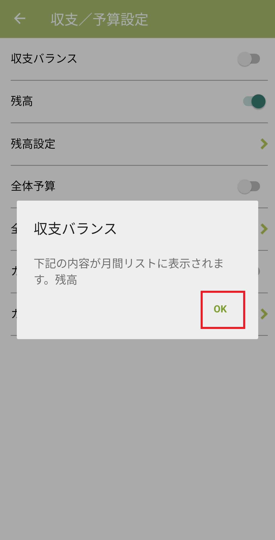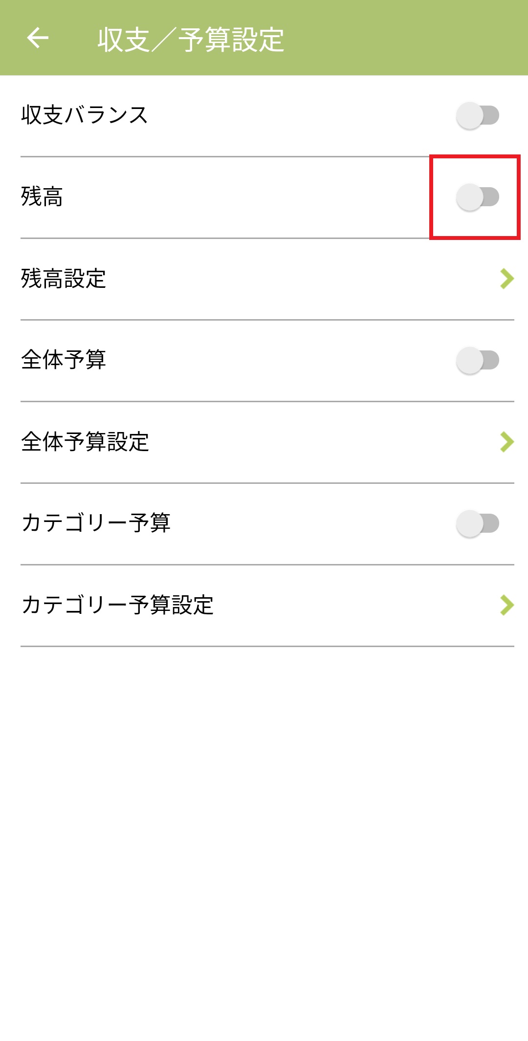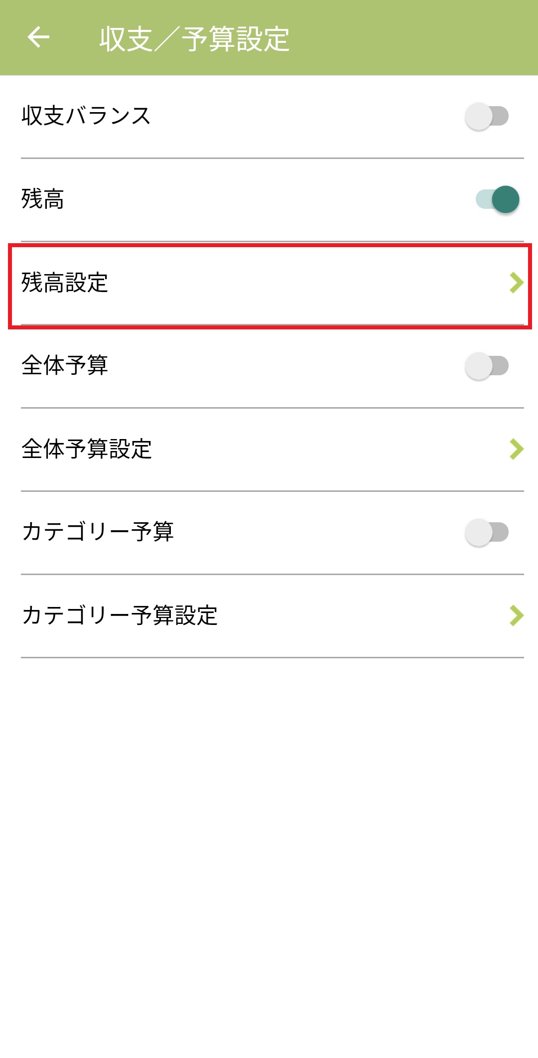 6.「残高」をオンに切り替えた後、「残高」ボタンの下の「残高設定」を押します。