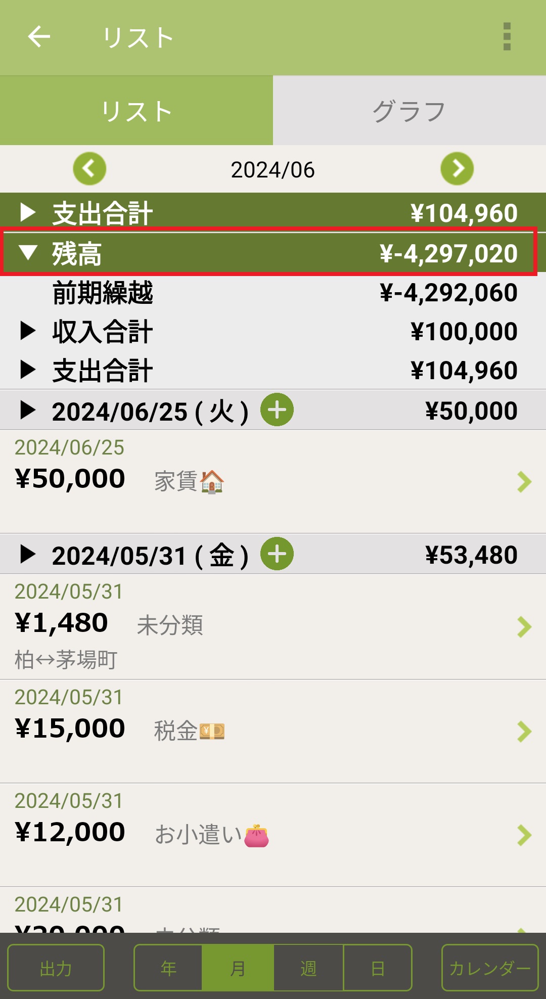 *『全期間』にチェックをいれると、残高バーに「前期繰越」と表示がされ、おカネレコ上の過去全ての収支が前期繰越に計上されます。