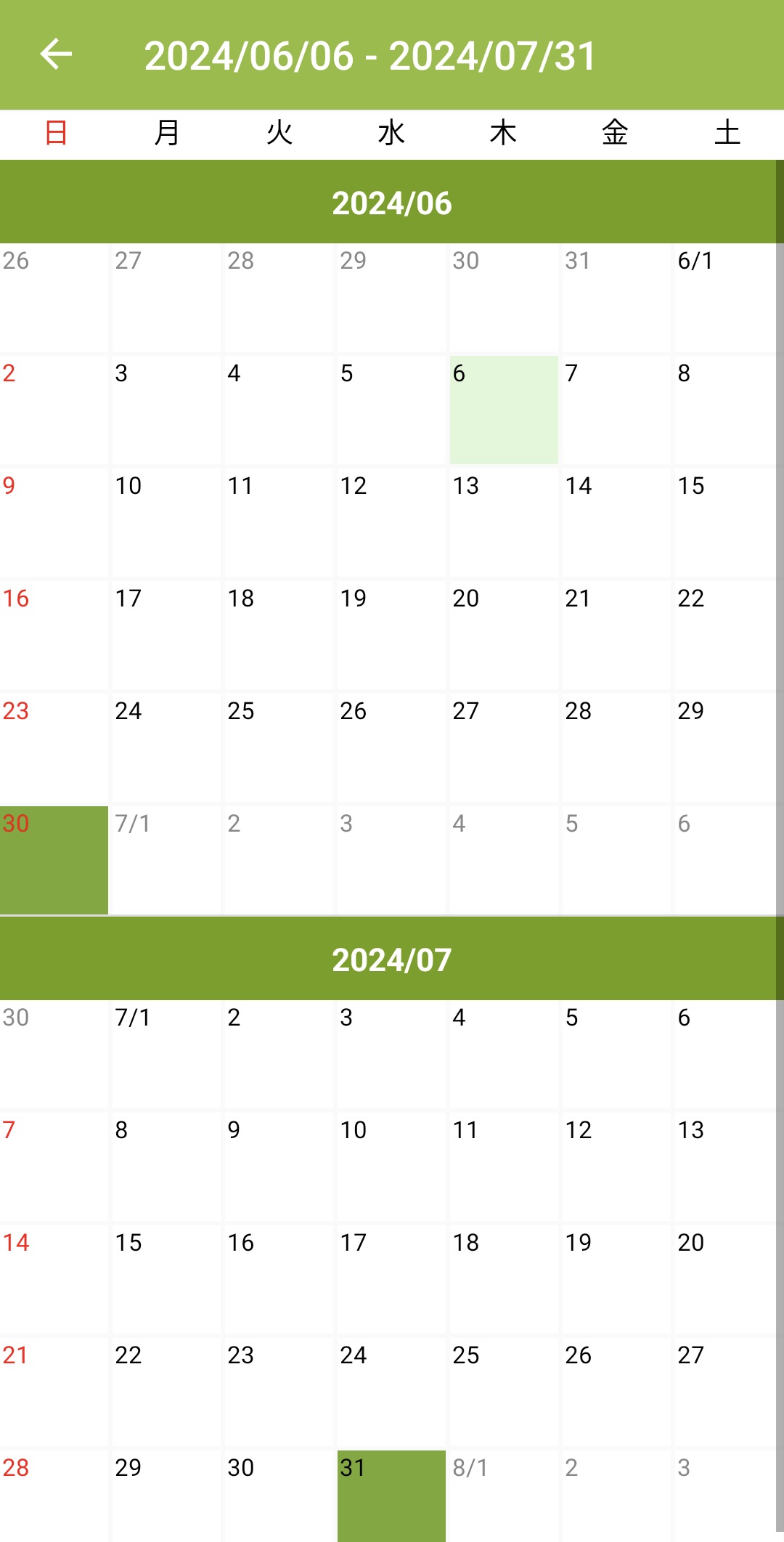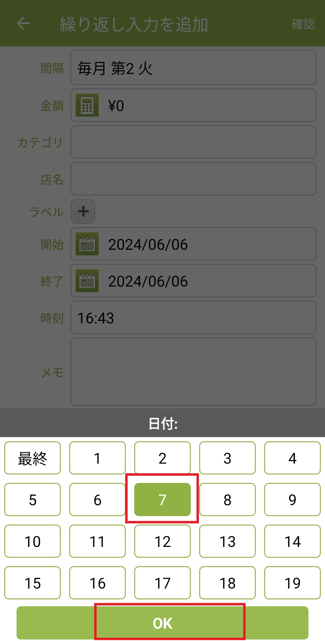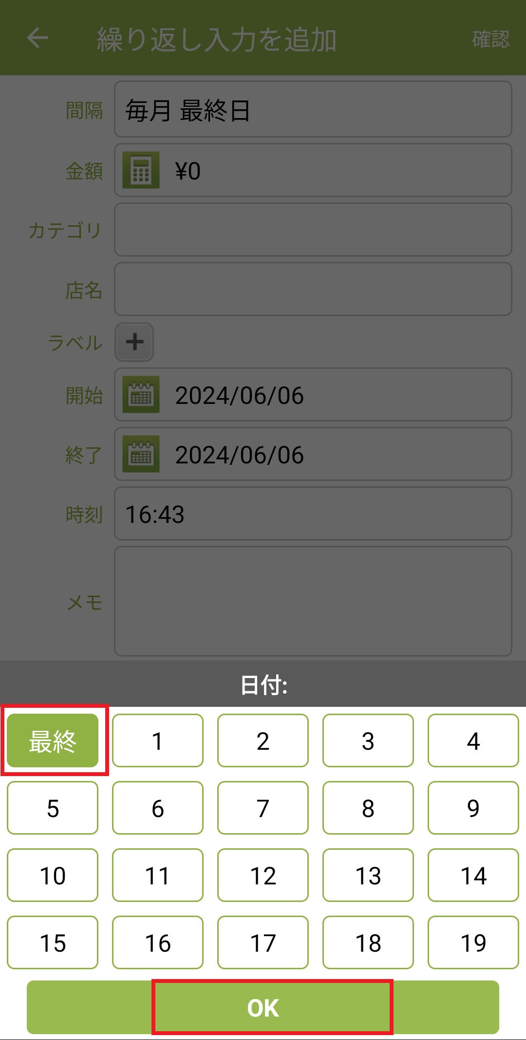 ※最終日以外を設定する場合は、最初に左上の「最終」を押して選択を解除した上、指定の日付を押してください。選択した日付が緑色に反転したら、「OK」を押します。