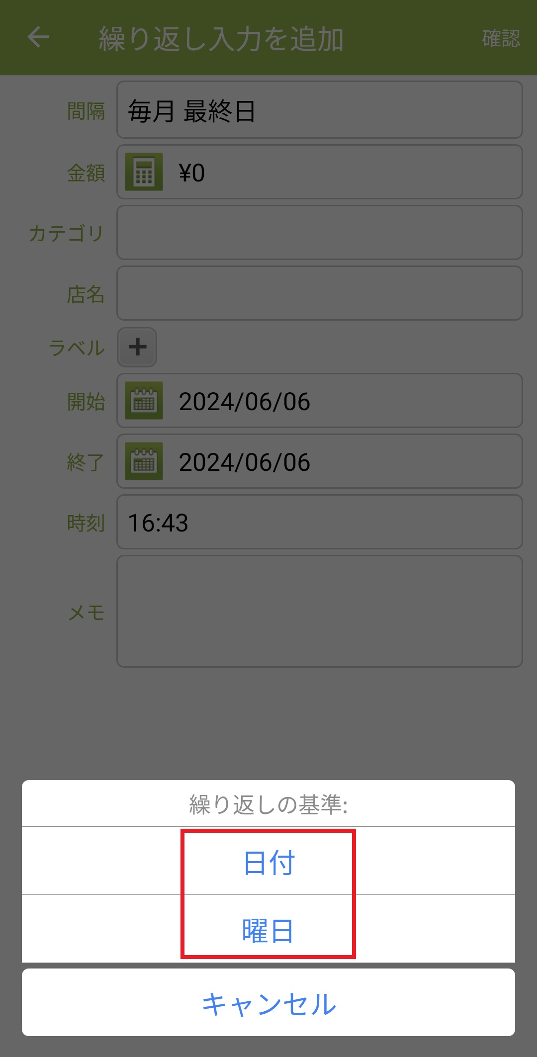 7. 繰り返しを日付または曜日で設定します。特定の日付(毎月25日など)を指定したい場合は「日付」を押します。