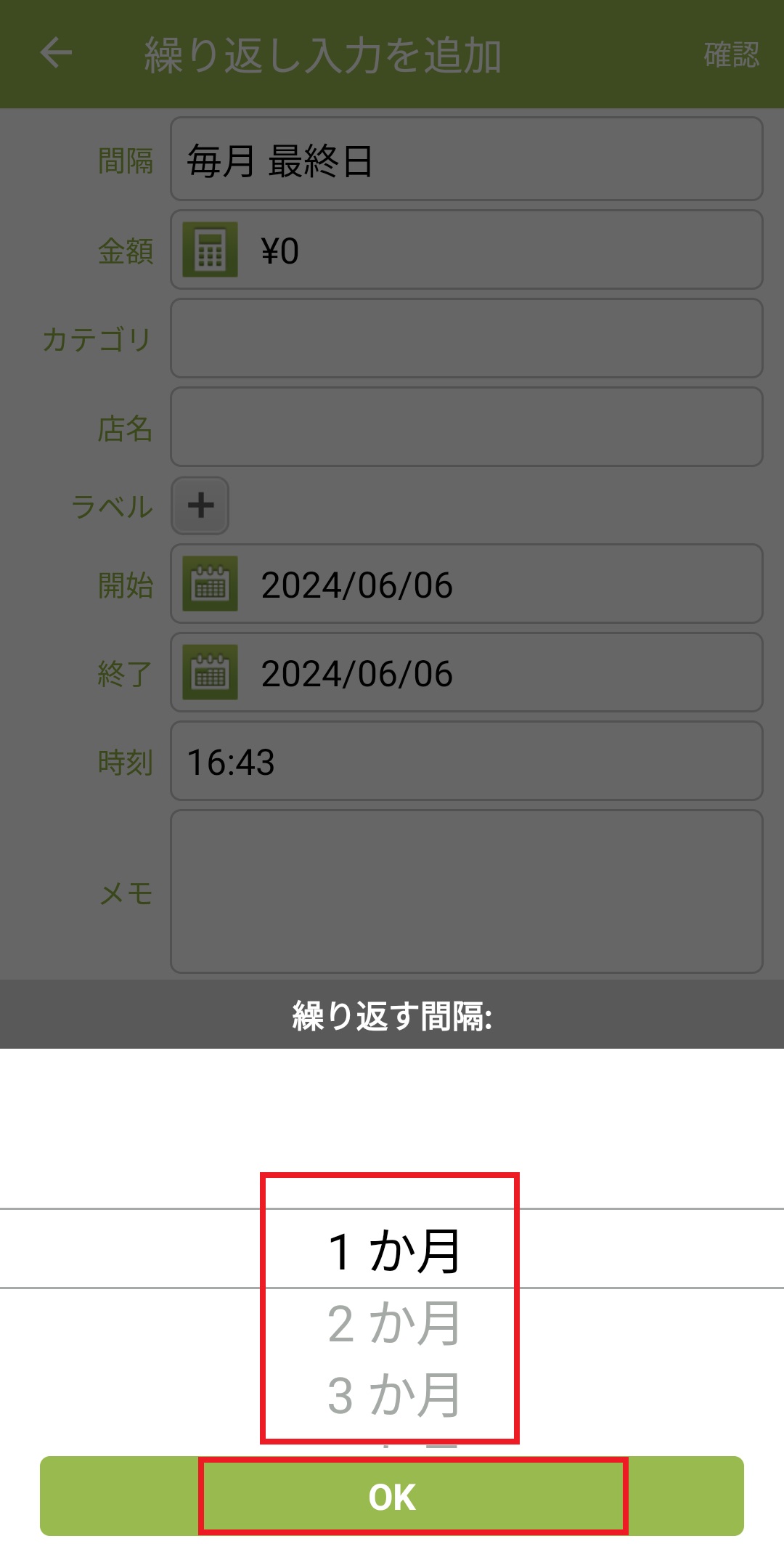 8. 繰り返しの間隔を指定します。1か月に1回の場合は「1か月」を押し、「OK」を押します。