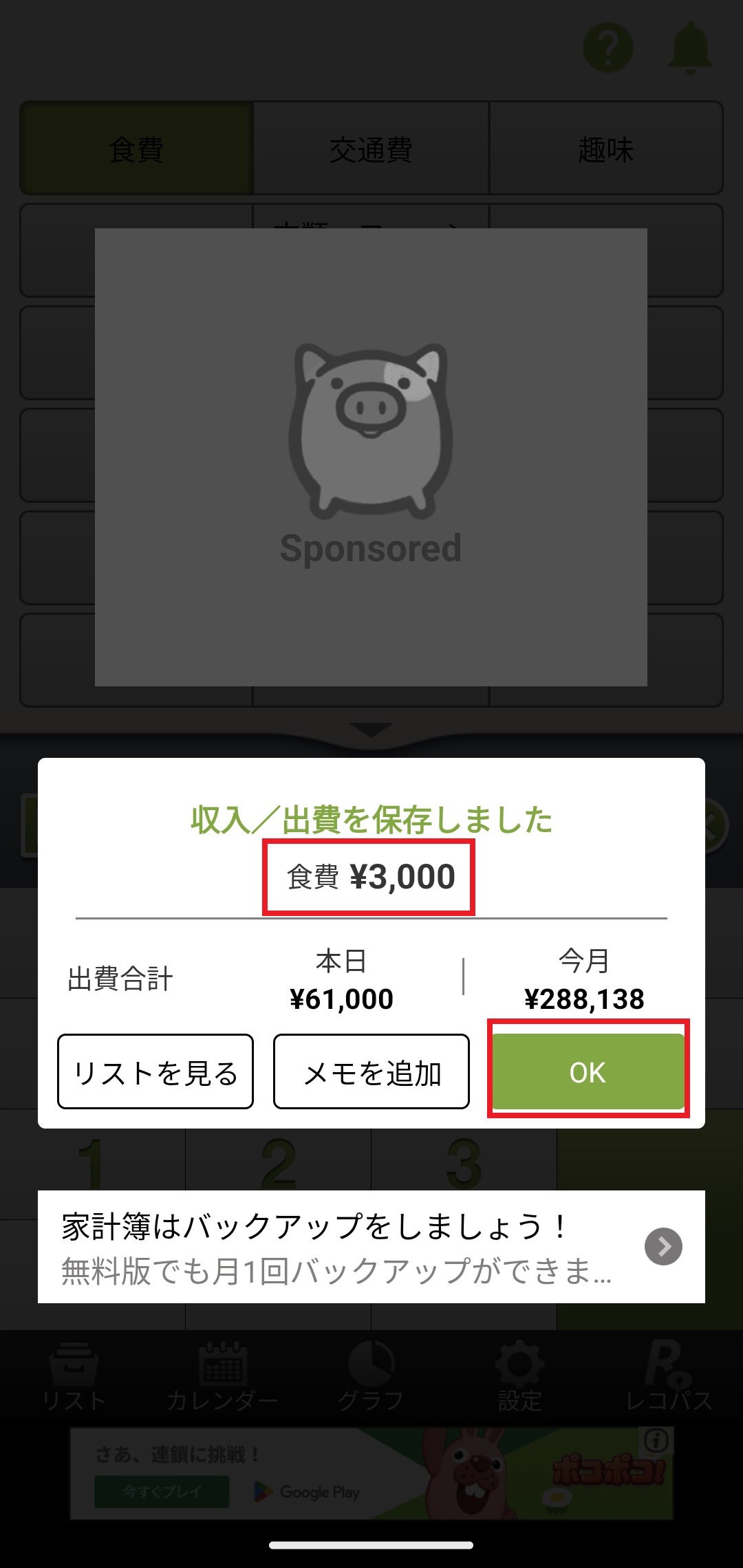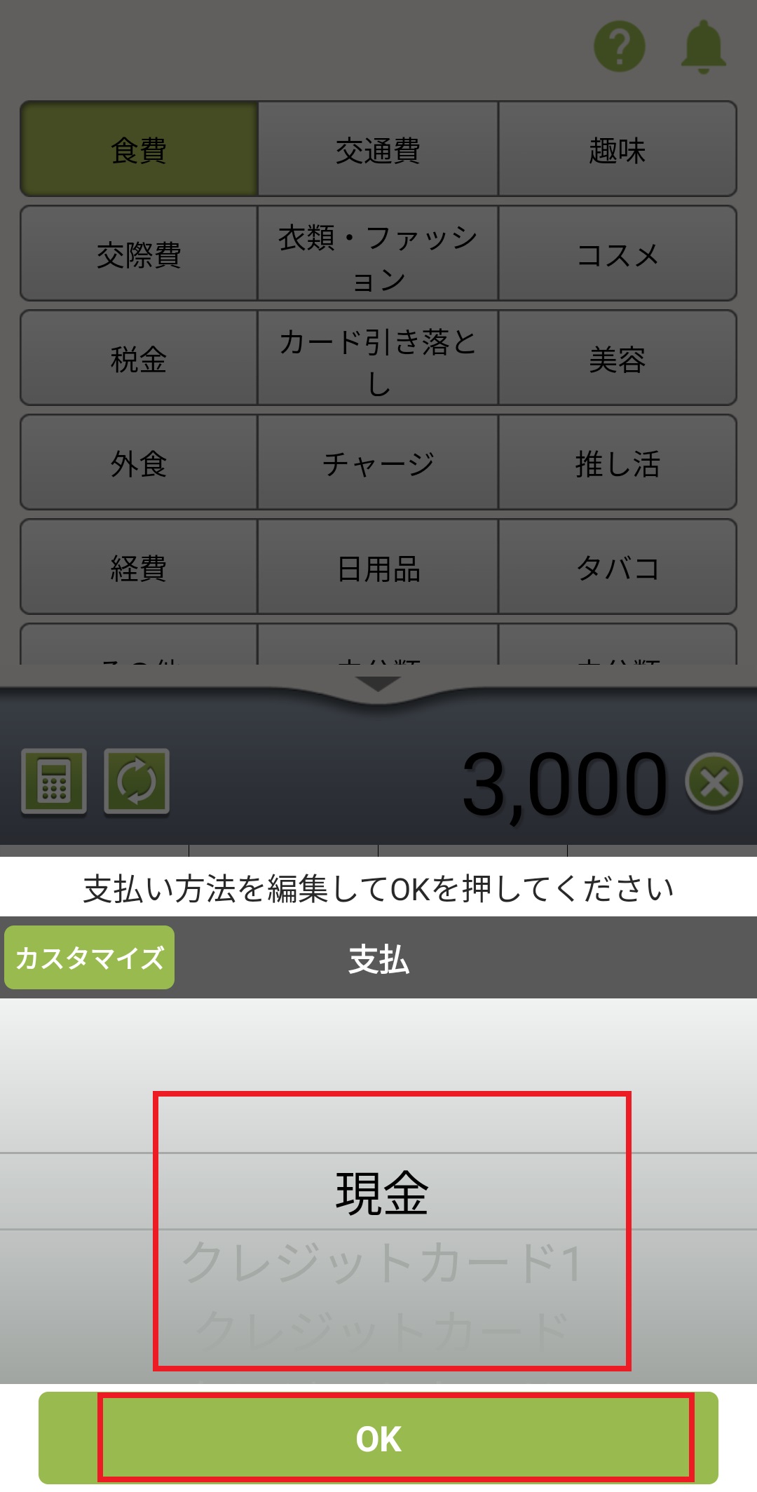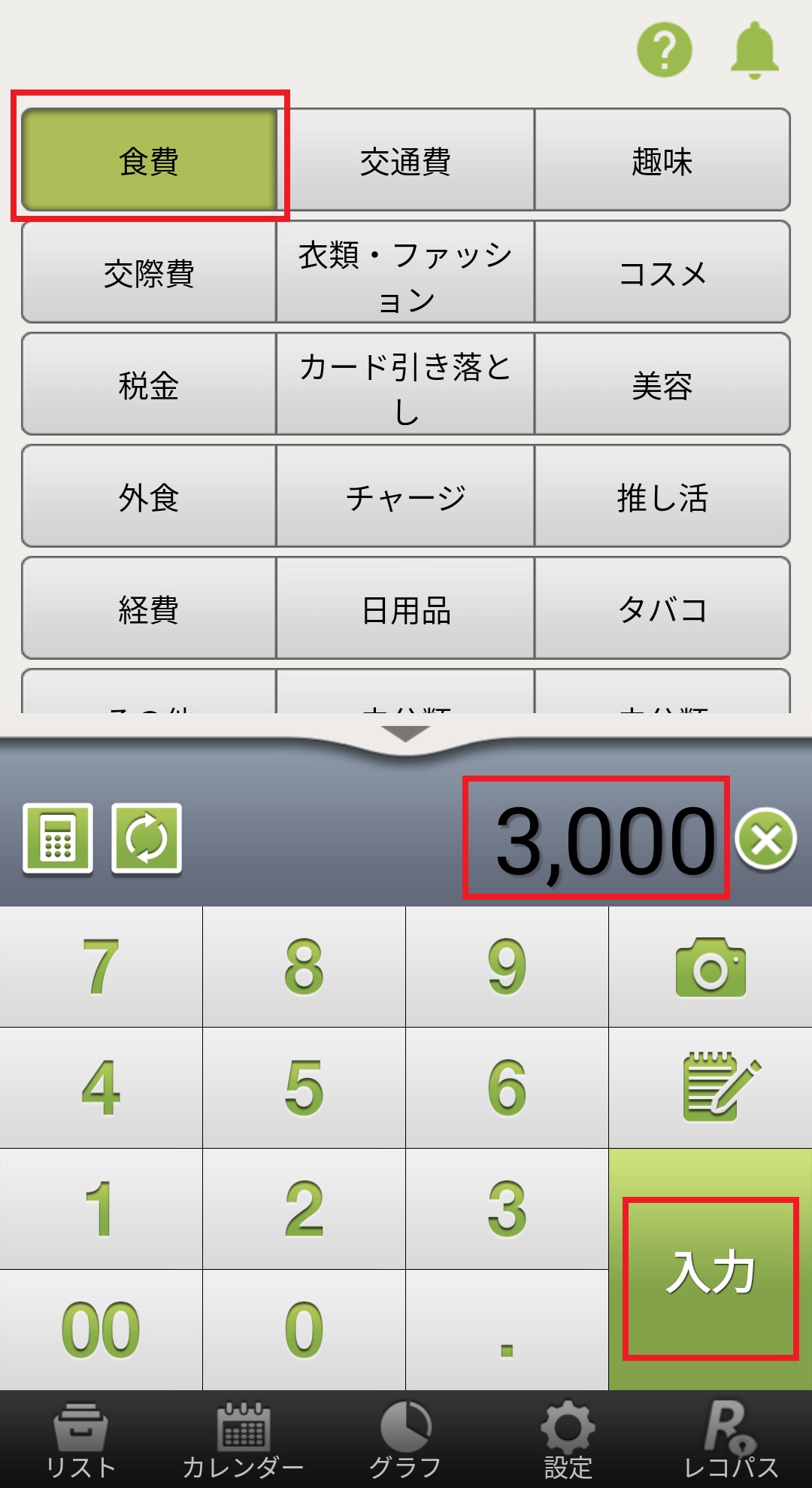 5. ホーム画面でカテゴリーを選択し、金額を入力後、「入力」ボタンを押します。