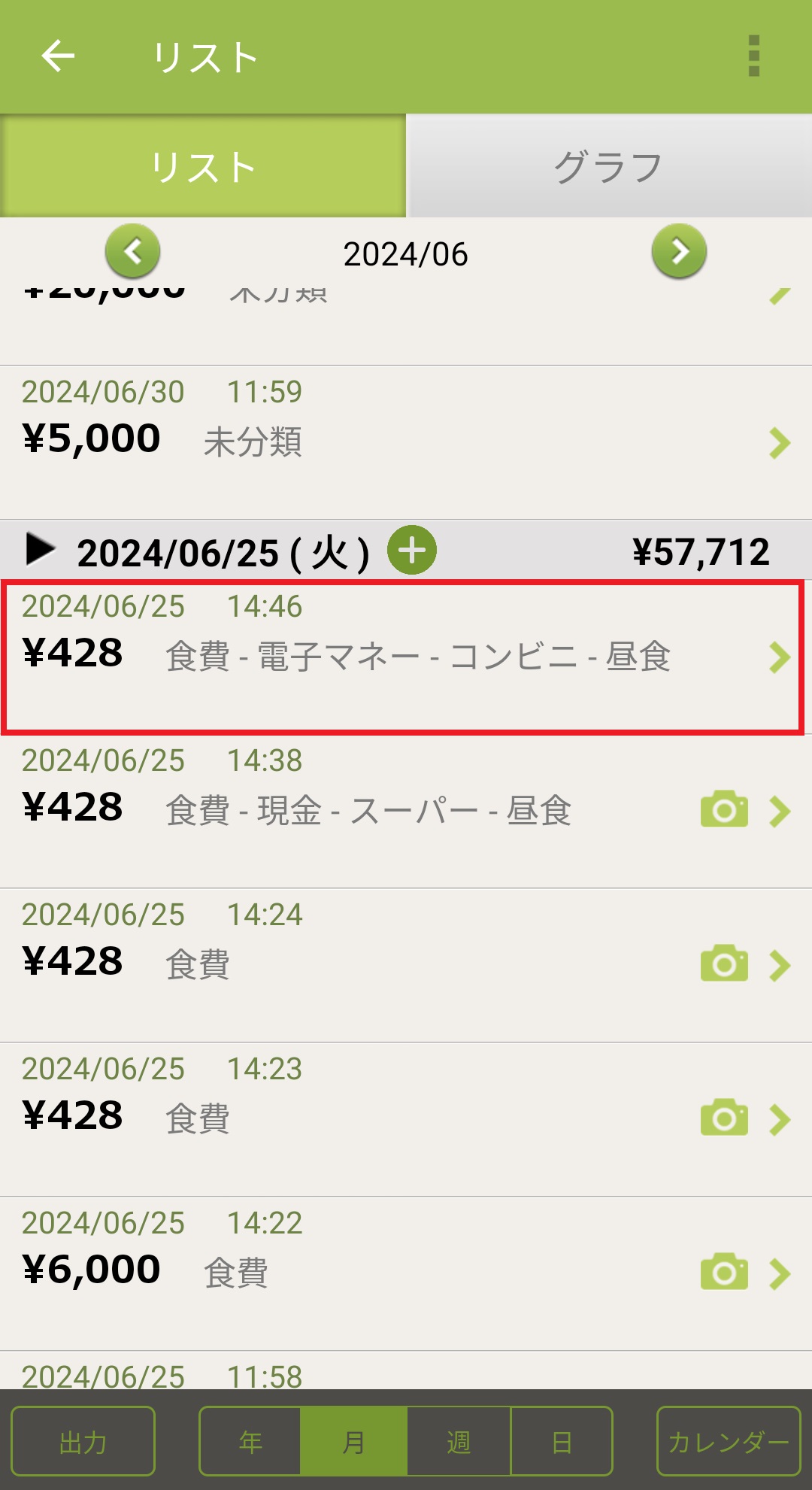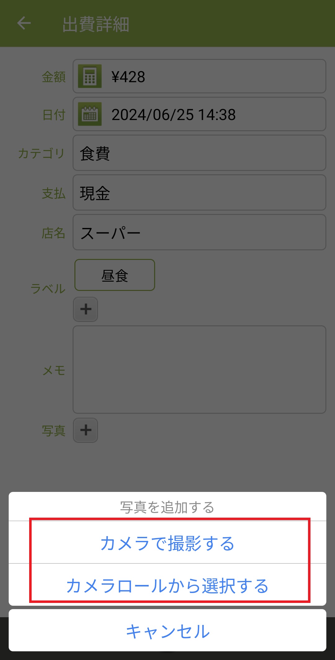 過去に入力した出費/収入に写真を追加する方法 Android版 2024/08/20 【過去に入力した出費/収入に写真を追加する方法】 1. おカネレコを起動し、トップ画面下部の「リスト」を押します。 2. 写真を追加したい出費/収入リストを押します。 3. 詳細の一番下にある「写真」のとなりにある「+ボタン」を押します。 4. 写真を選択もしくは撮影します。 5. 詳細画面に写真が追加されます。「<戻る」ボタンで登録完了です。