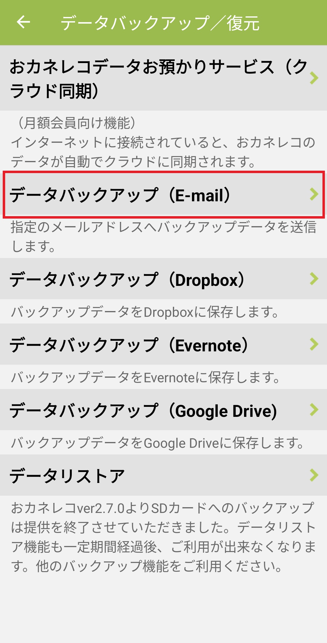 4. 「データバックアップ(E-mail)」を押します。