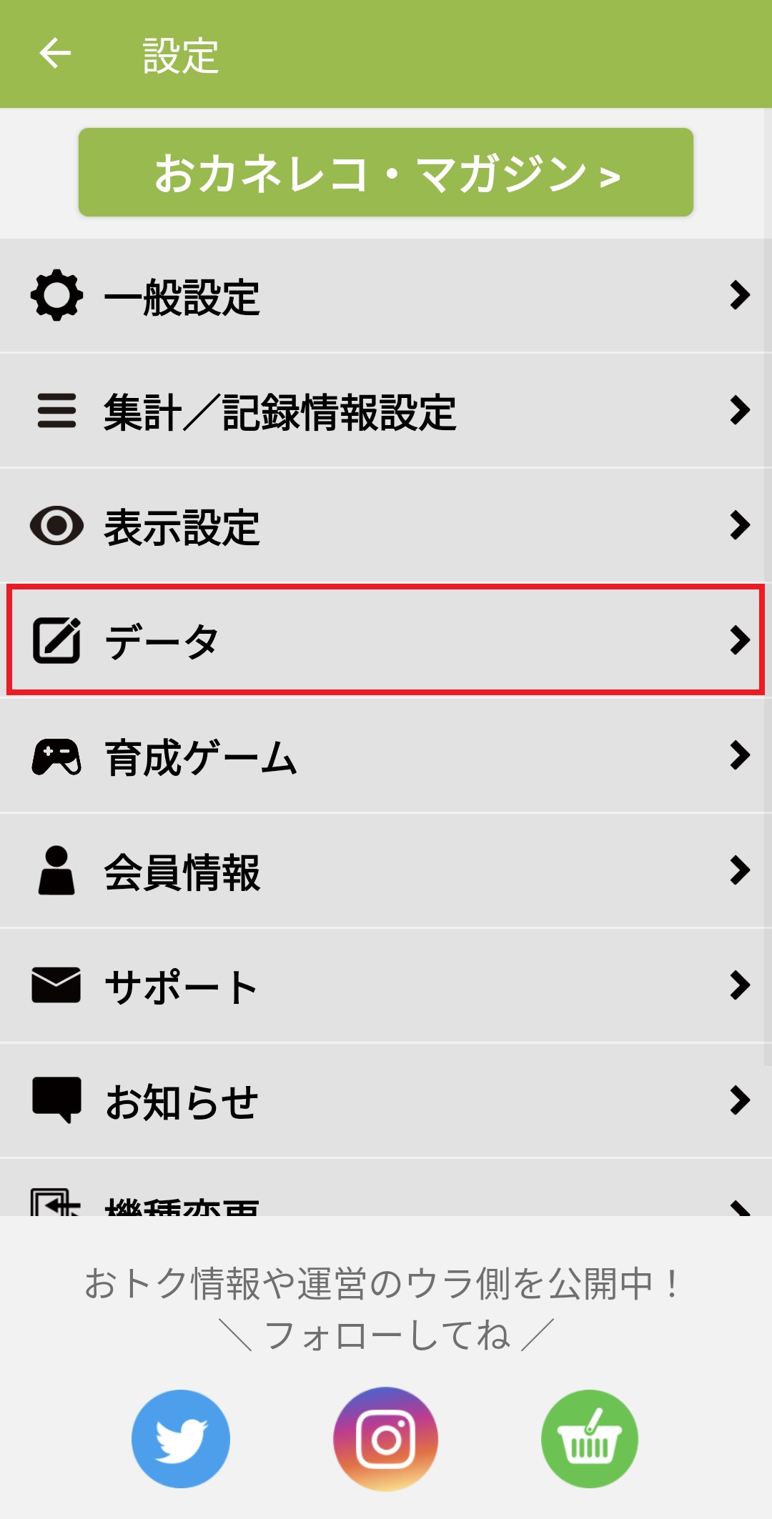 2. 「データ」を押します。