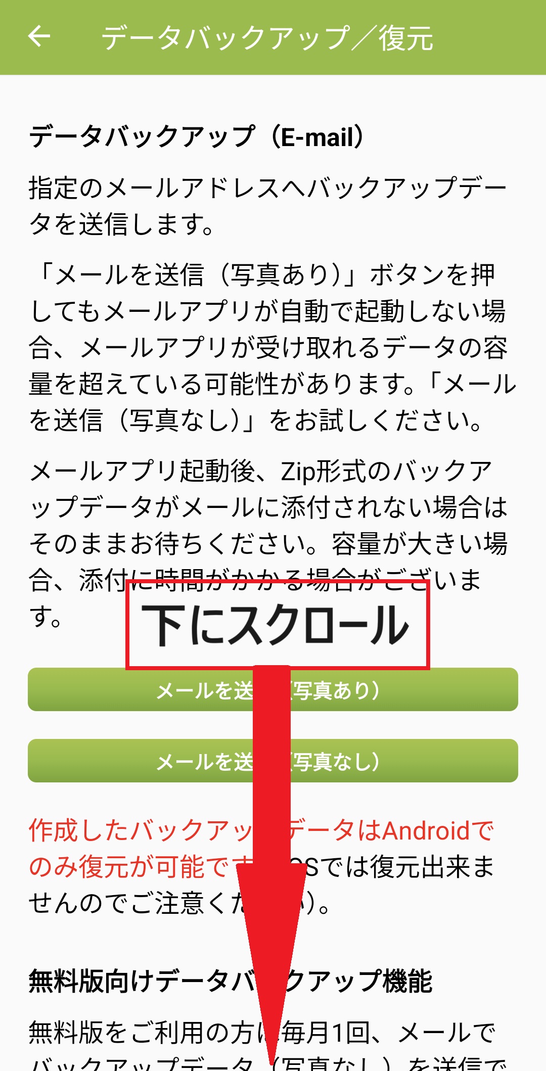 5. 画面を下の方へスクロールすると、「無料版向けデータバックアップ機能」が表示されます。