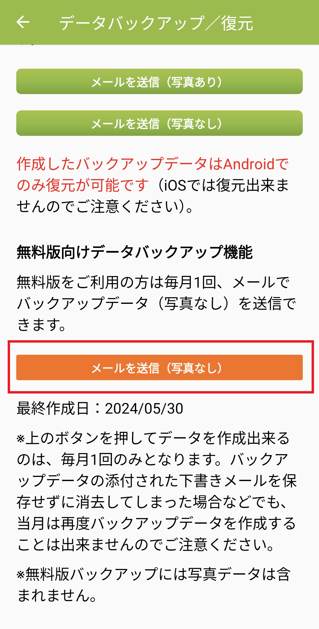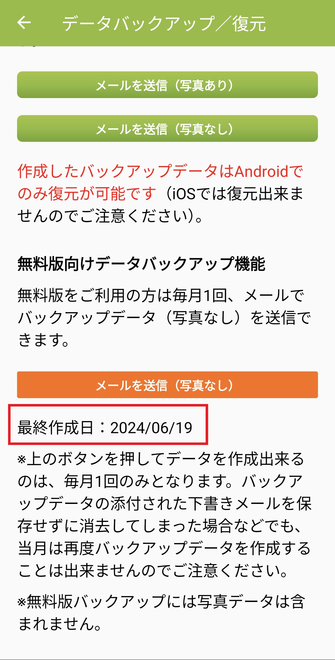 9. アプリに最終のバックアップ作成日時が表示されます。