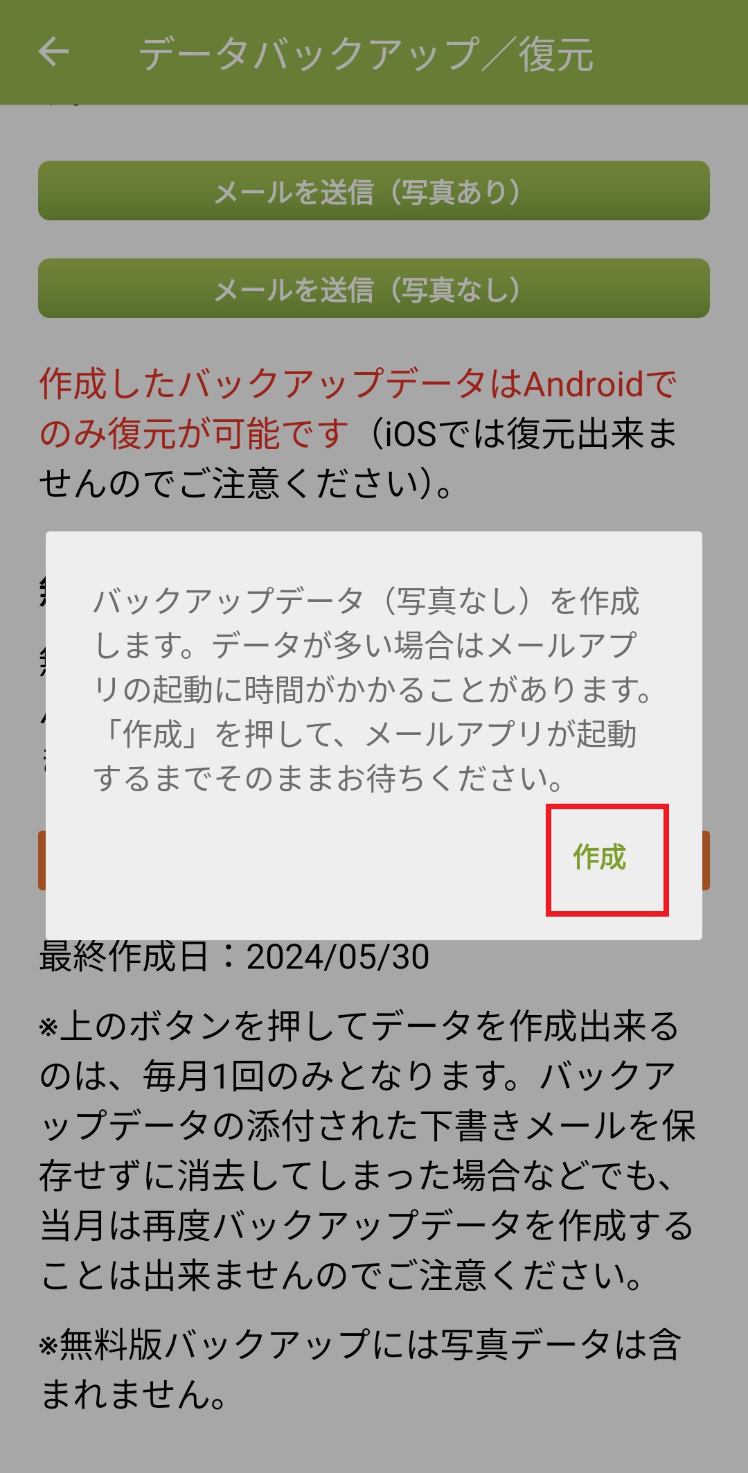 6. 注意書きを読み、「作成」を押します。