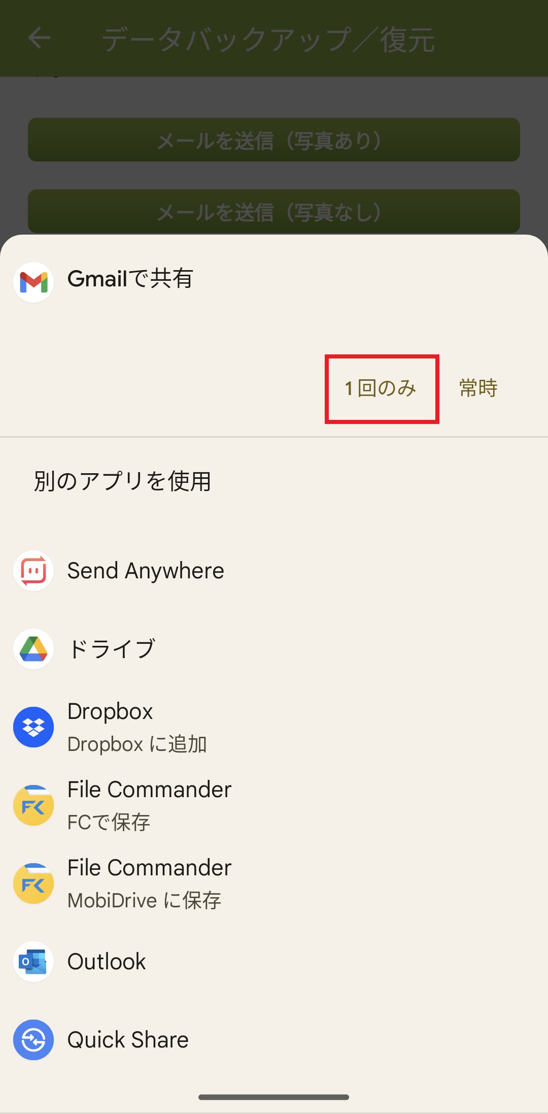 7. 「Gmailで共有」を選択し、『1回のみ』を押す。