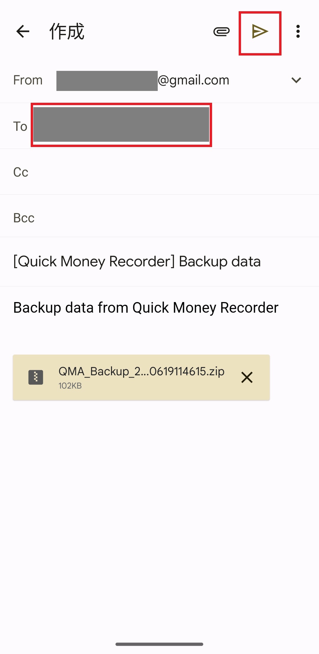 バックアップファイルが添付されていることをご確認の上、送信してください。
