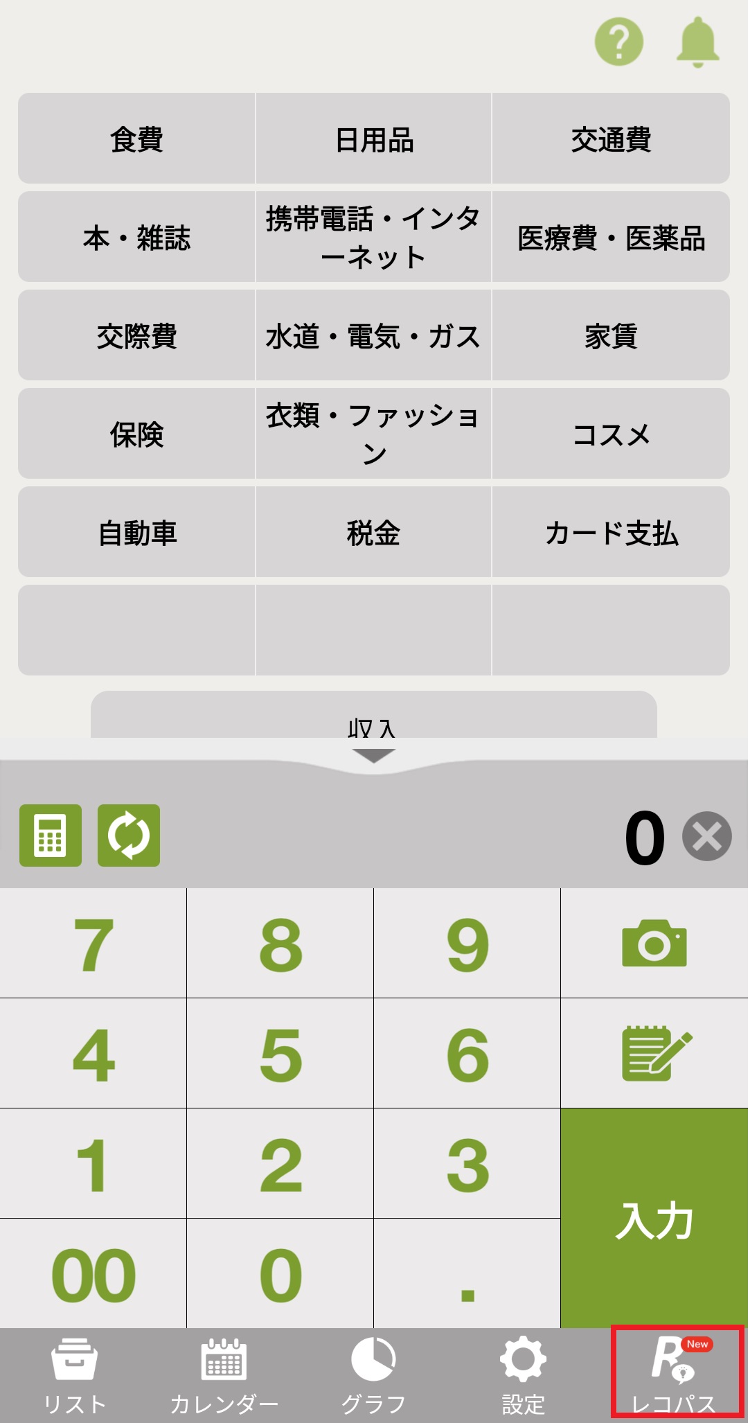 1.おカネレコ起動後、入力画面右下の「レコパス」を押します。