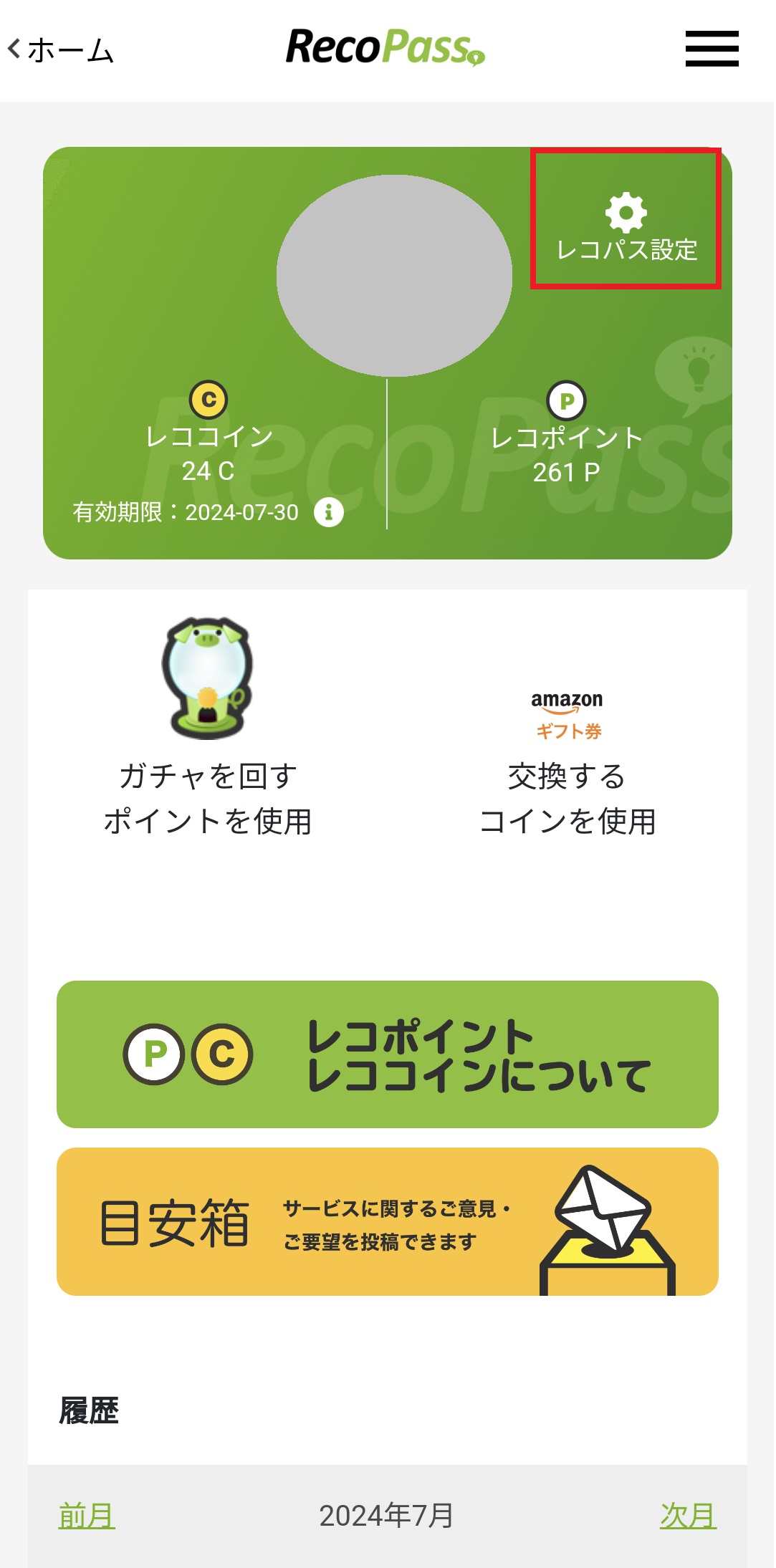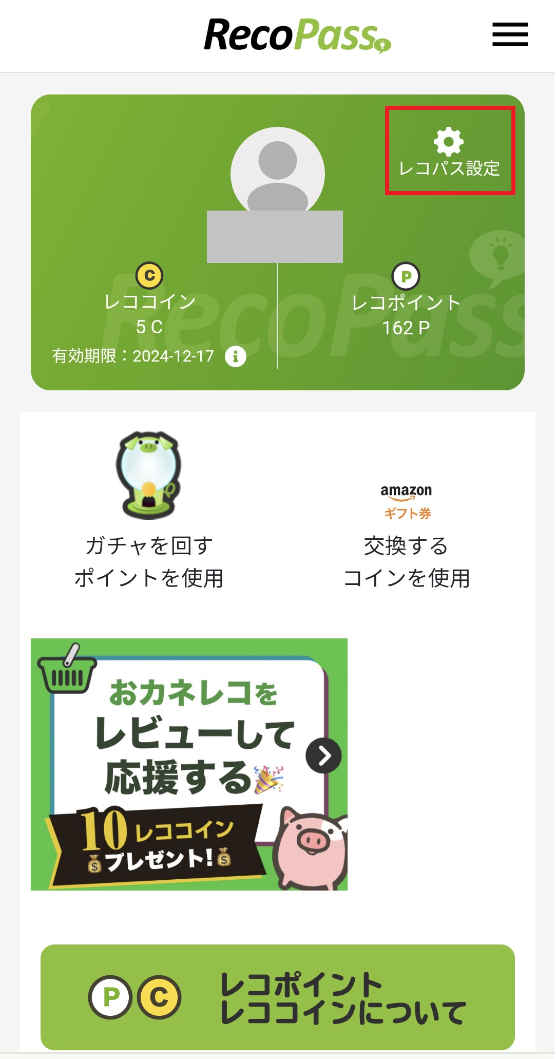 3.レコパスの画面が表示されます。プロフィール画像(画面中央の丸い画像)の右上に表示されている「レコパス設定」を押します。