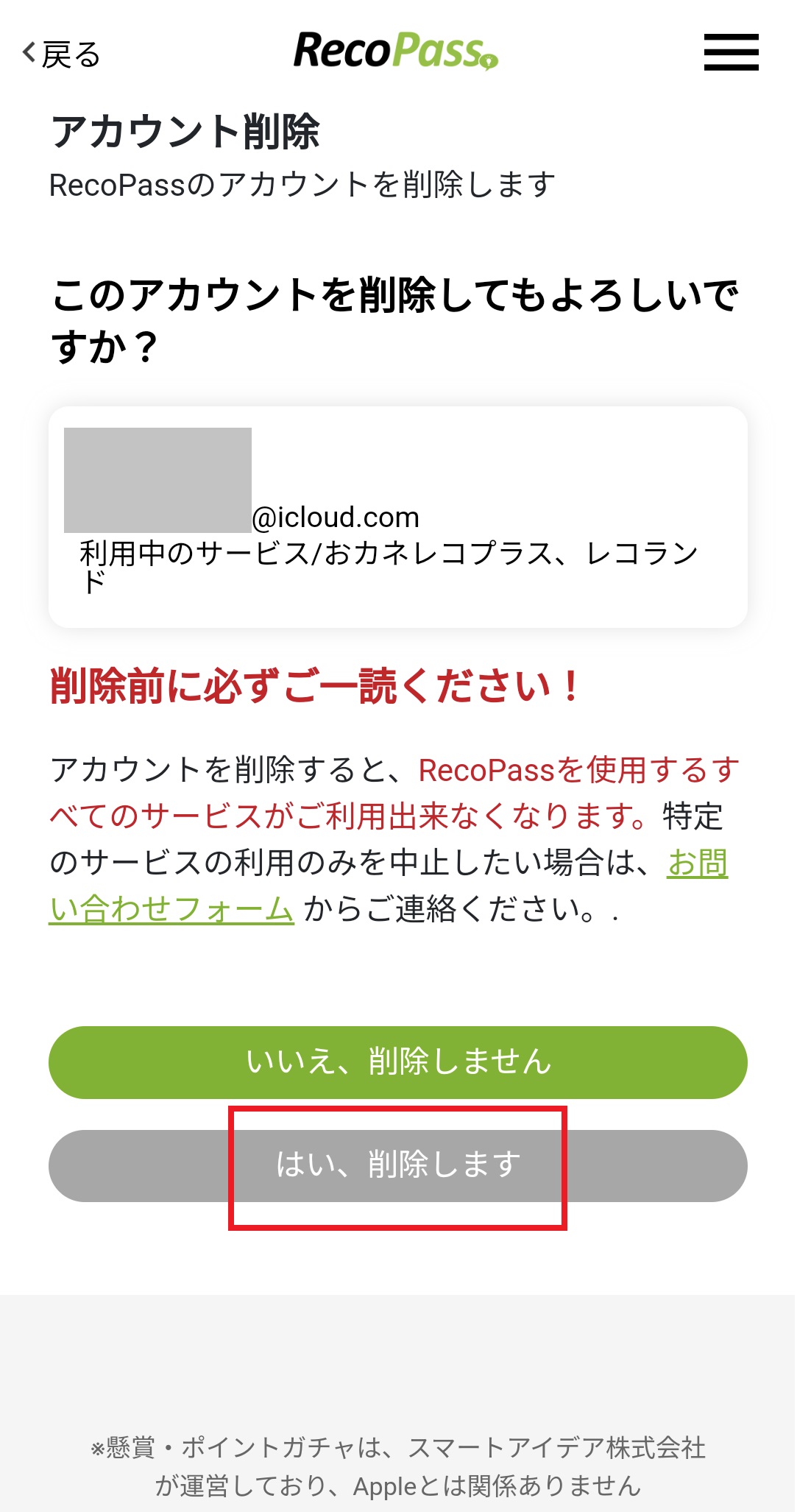 ※アカウントの削除が上手くいかないという場合は、恐れ入りますがご登録いただいているメールアドレスをご教示くださいますようお願い致します。