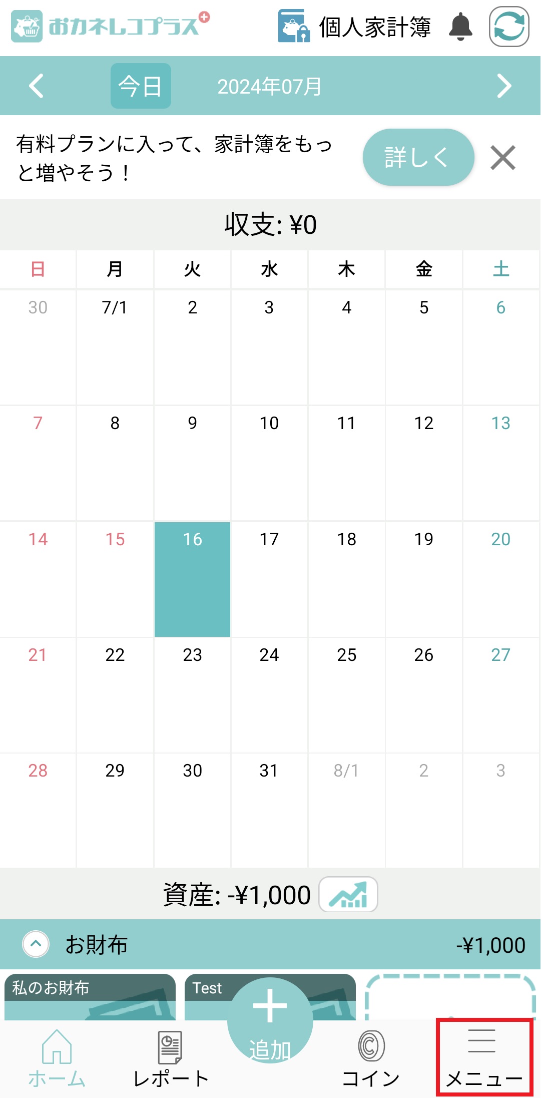 1.おカネレコプラスカレンダー画面下の「メニュー」を押します。