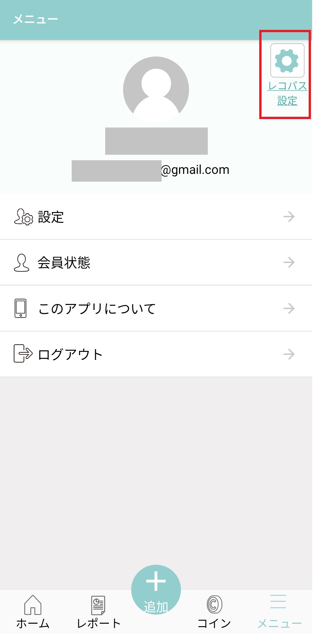 2.レコパス画面上部のプロフィールアイコン(アカウント名上に表示される丸いアイコン)の右斜め上に表示される「レコパス設定」を押します。