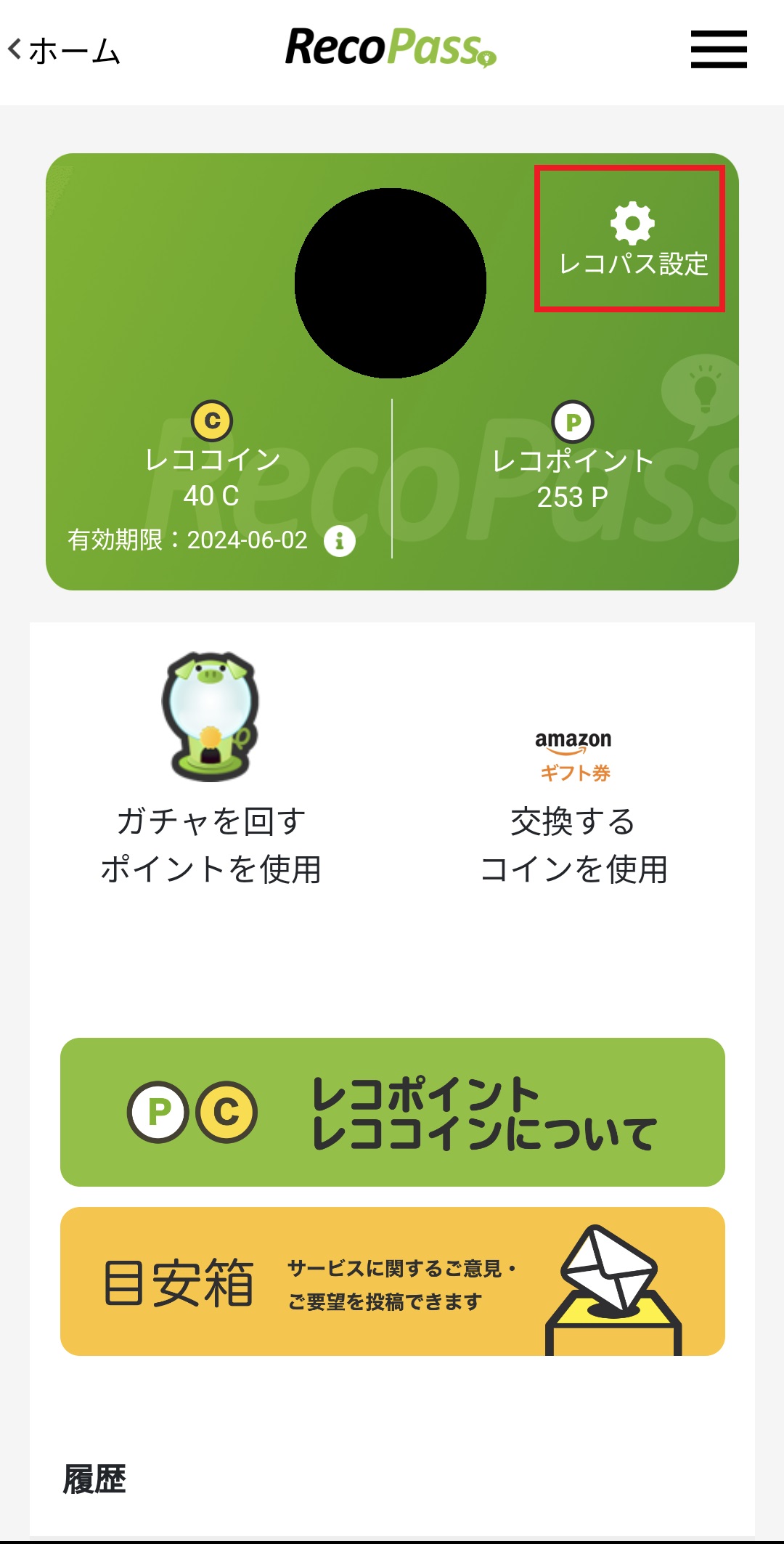 2.レコID画面上部のプロフィールアイコン(アカウント名上に表示される丸いアイコン)の右斜め上に表示される「レコパス設定」を押します。