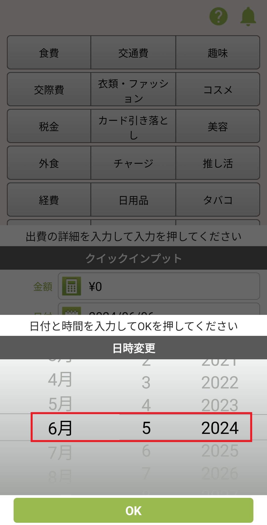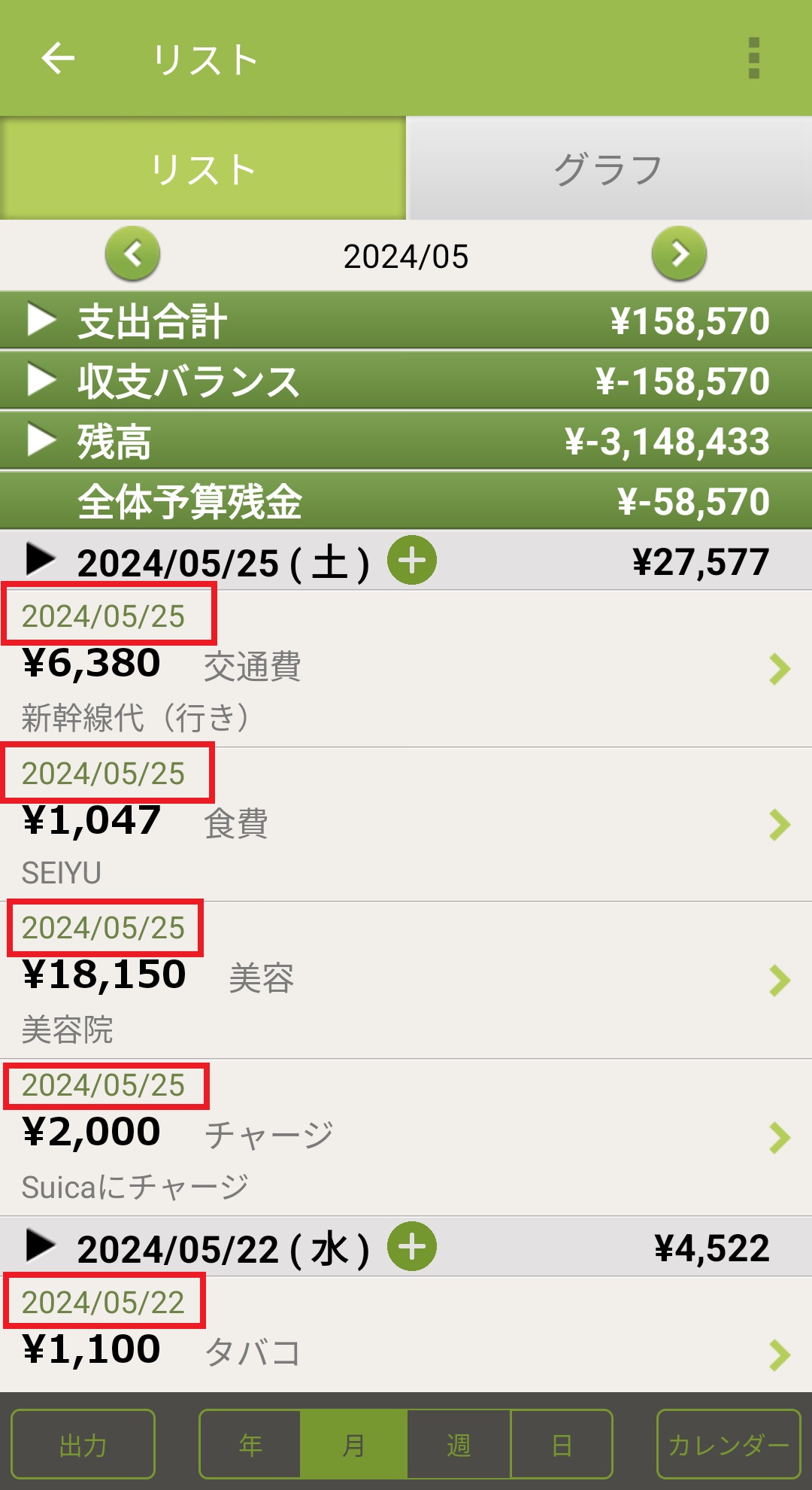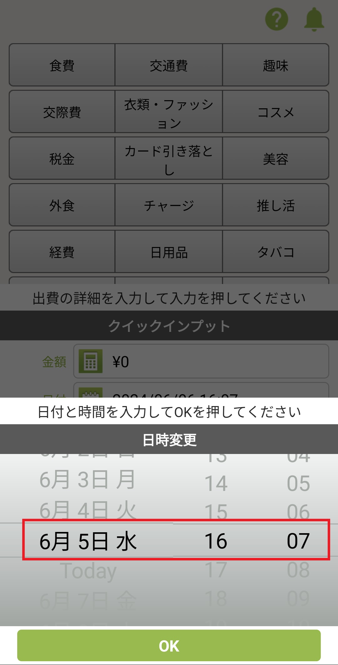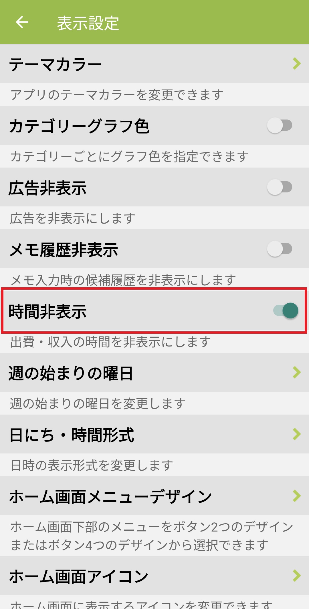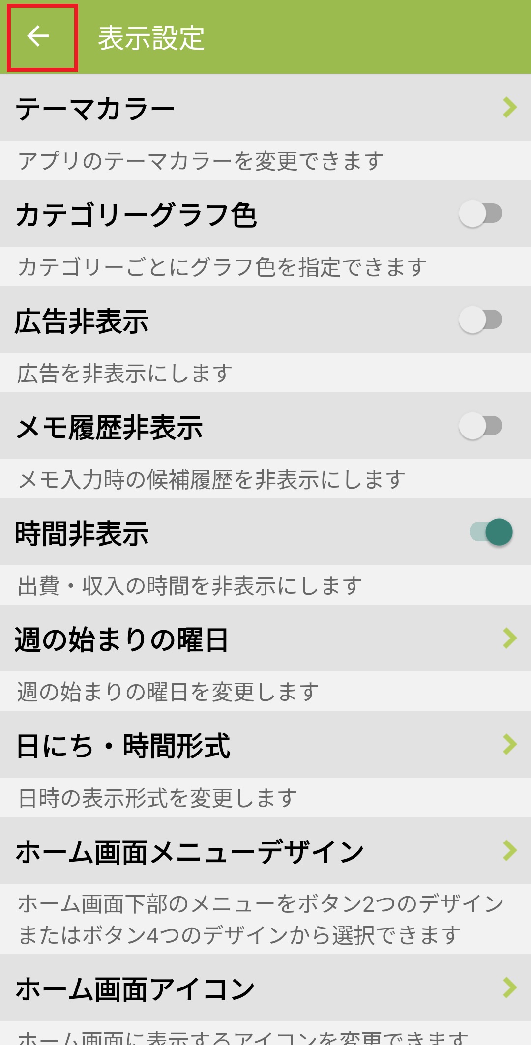 出費・収入の時間を非表示にする方法 Android版 2024/08/20 出費・収入の時間表示は下記の設定で非表示にすることが可能です。 1. おカネレコを起動し、入力画面下部の設定(歯車アイコン)を押します。 2.「表示設定」を押します。 3.「時間非表示」をオンにします。 4.画面右上の「<戻る」を押し、ホーム画面に戻ります。 5.リストを見ると出費・収入の時間が非表示になり、日付のみ表示されます。 ※詳細入力画面では下記のように変化します。 ~時間表示ありの場合~ ~時間表示なしの場合~