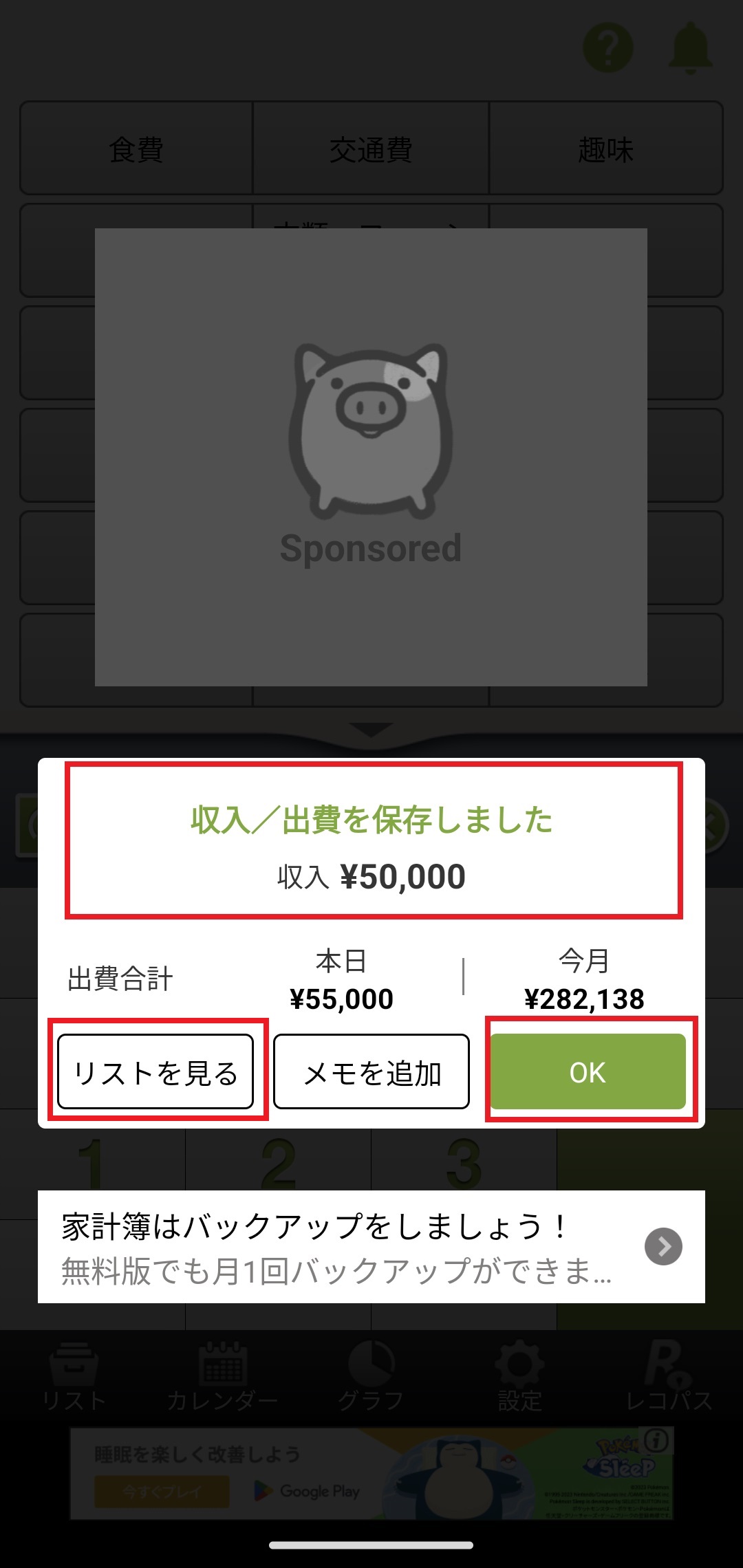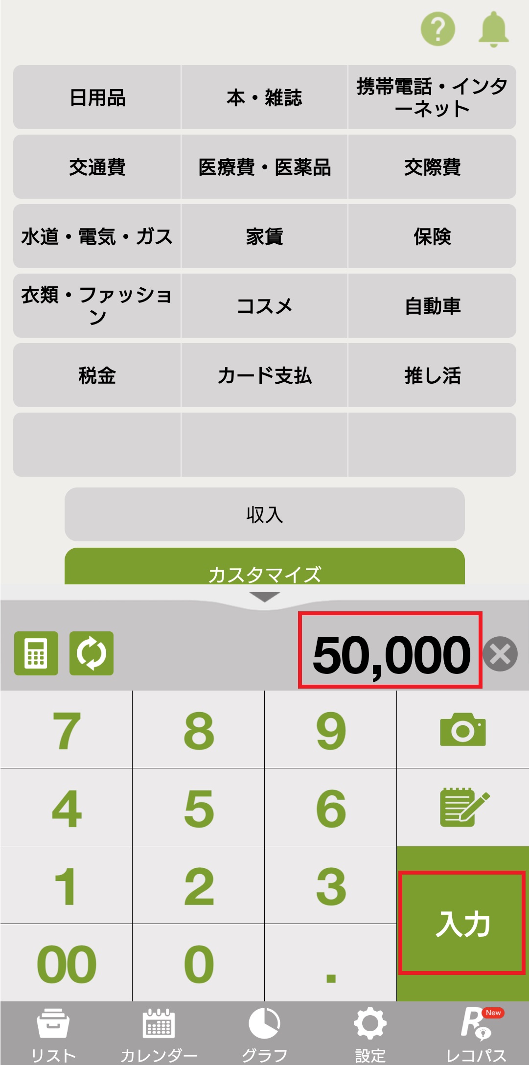 収入を登録するとグラフの下部に当月の収入から出費を引いた収支バランスが表示されるようになります。