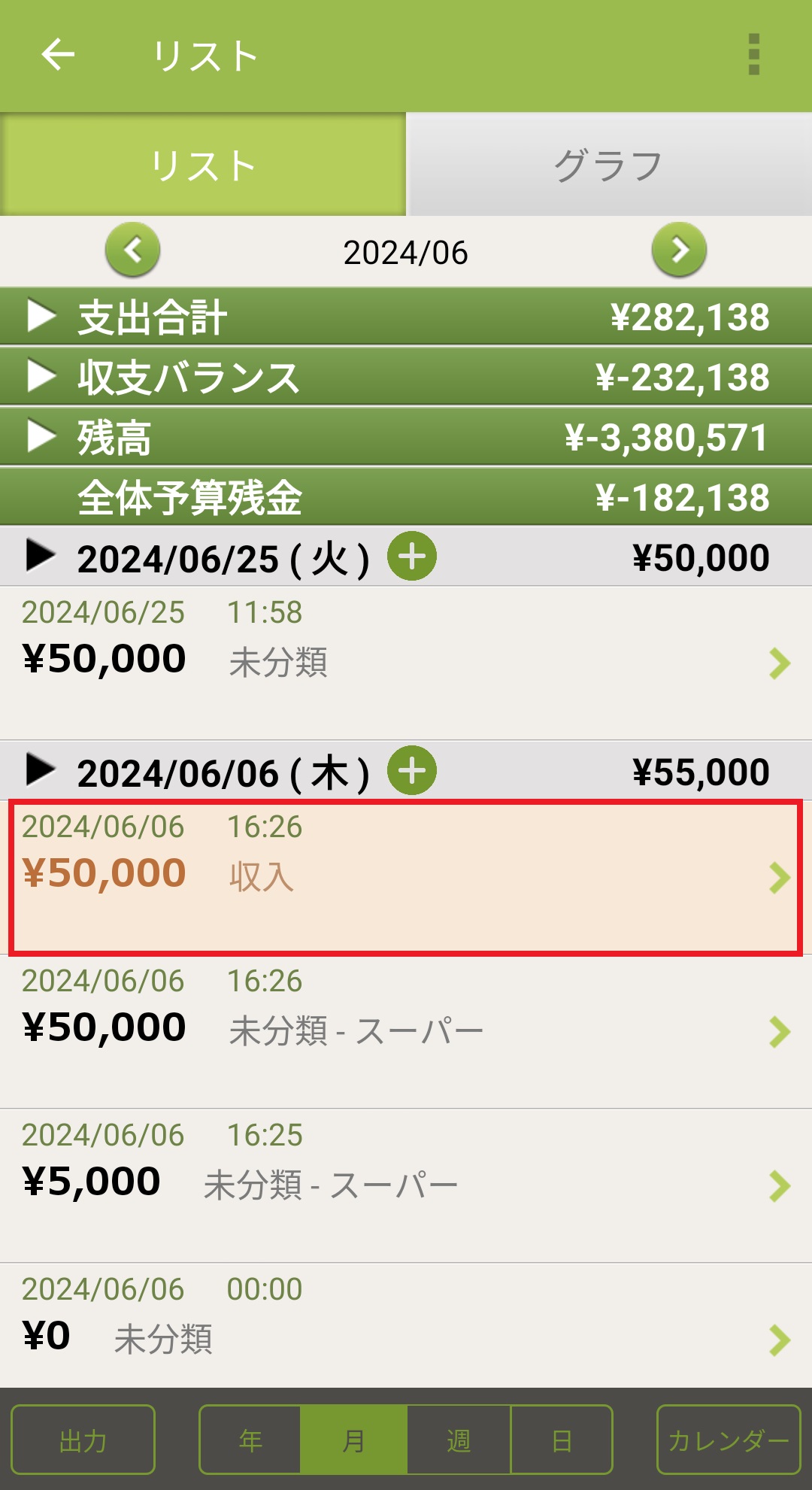 5. リストに「収入」が登録されます。収入は背景色と文字色が違う色で表示されます。