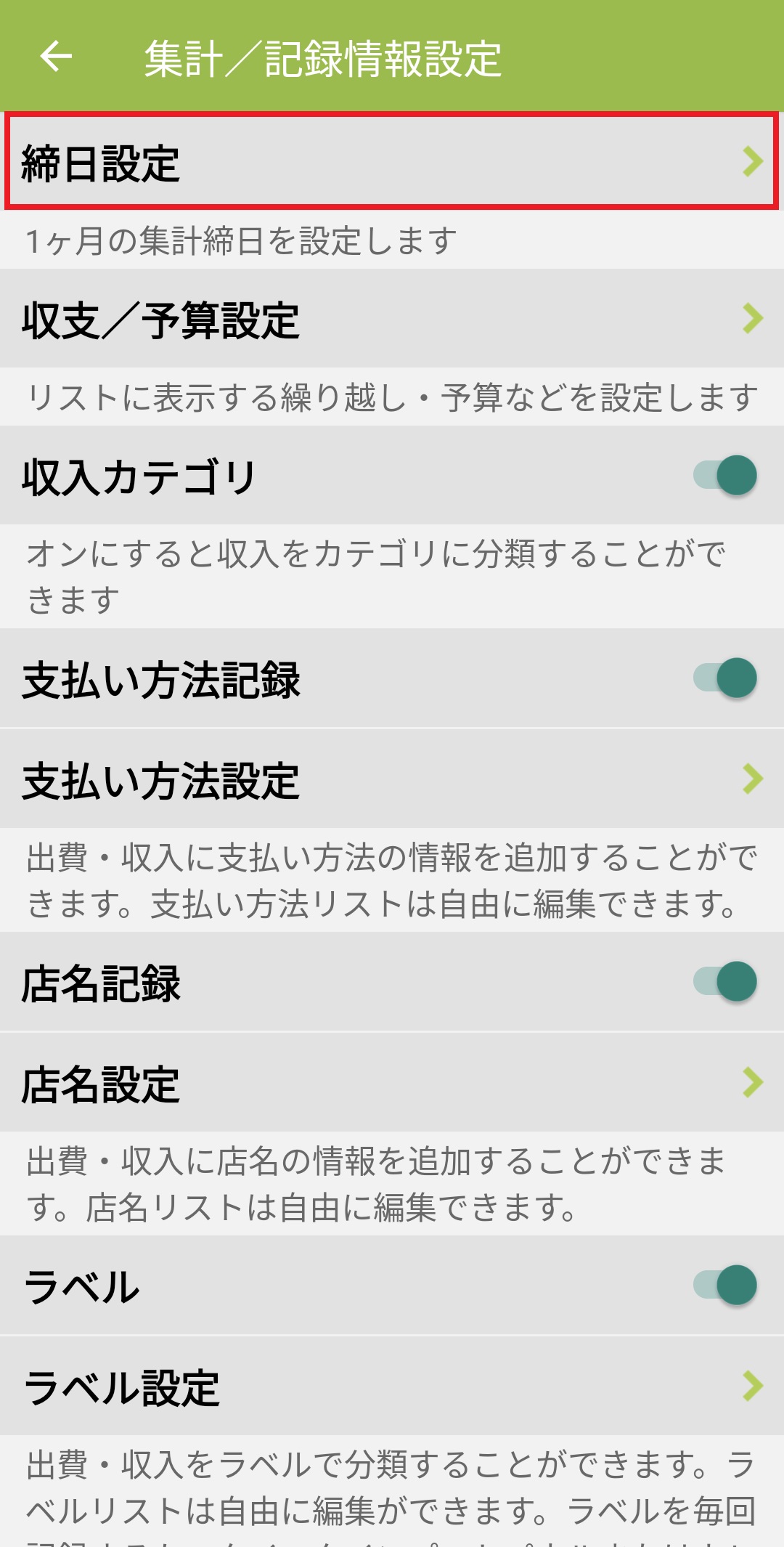 月の開始日の設定は、おカネレコの「締日設定」にて設定可能です。