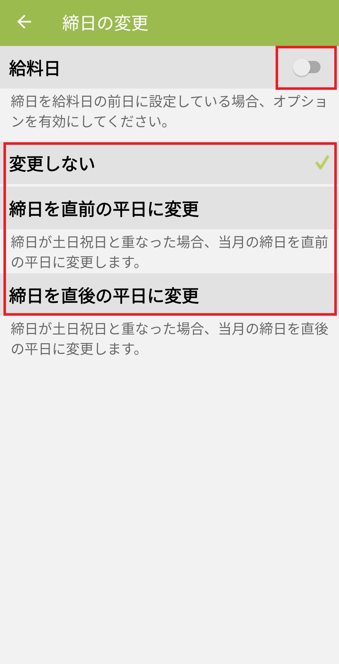 *締日を給料の前日に設定して、リストやカレンダーの集計期間の始まりを給料日にされる場合は、締日の変更画面で一番上の「給料日」オプションをオンにしてください。