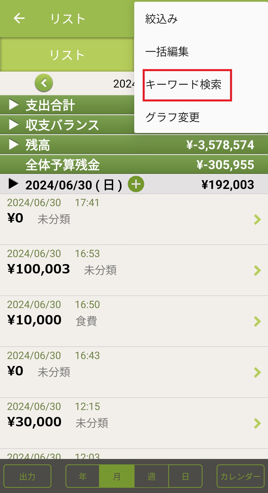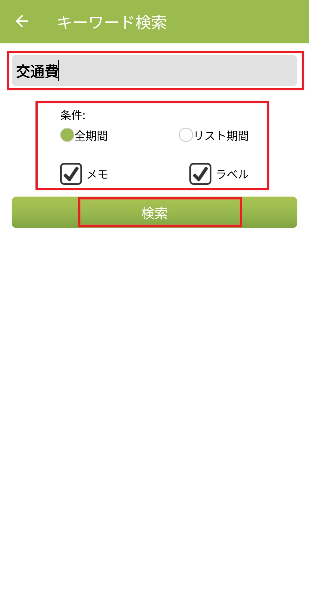 4.キーワード検索画面が表示されますので、キーワードを入力し条件(全期間・リスト期間・メモ・ラベル)のいずれかを選び下の検索したい項目にチェックを入れ「検索」を押します。