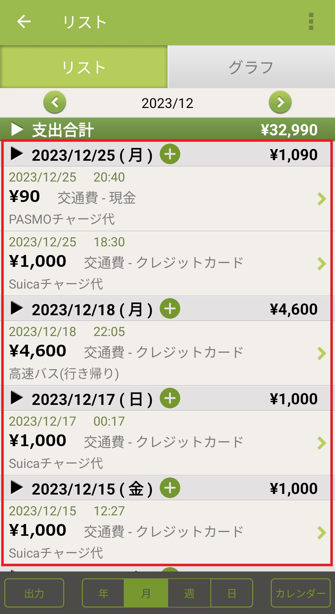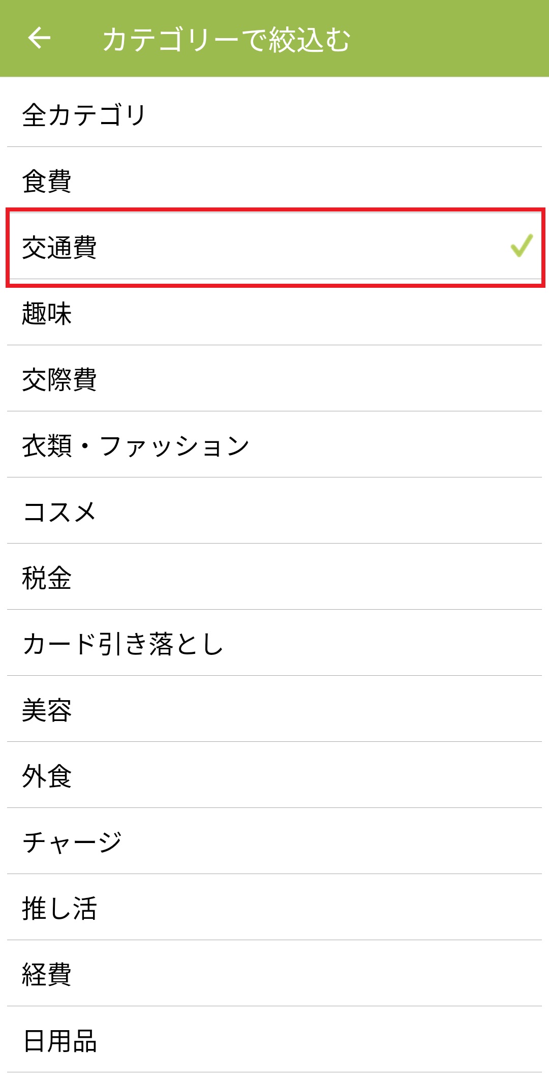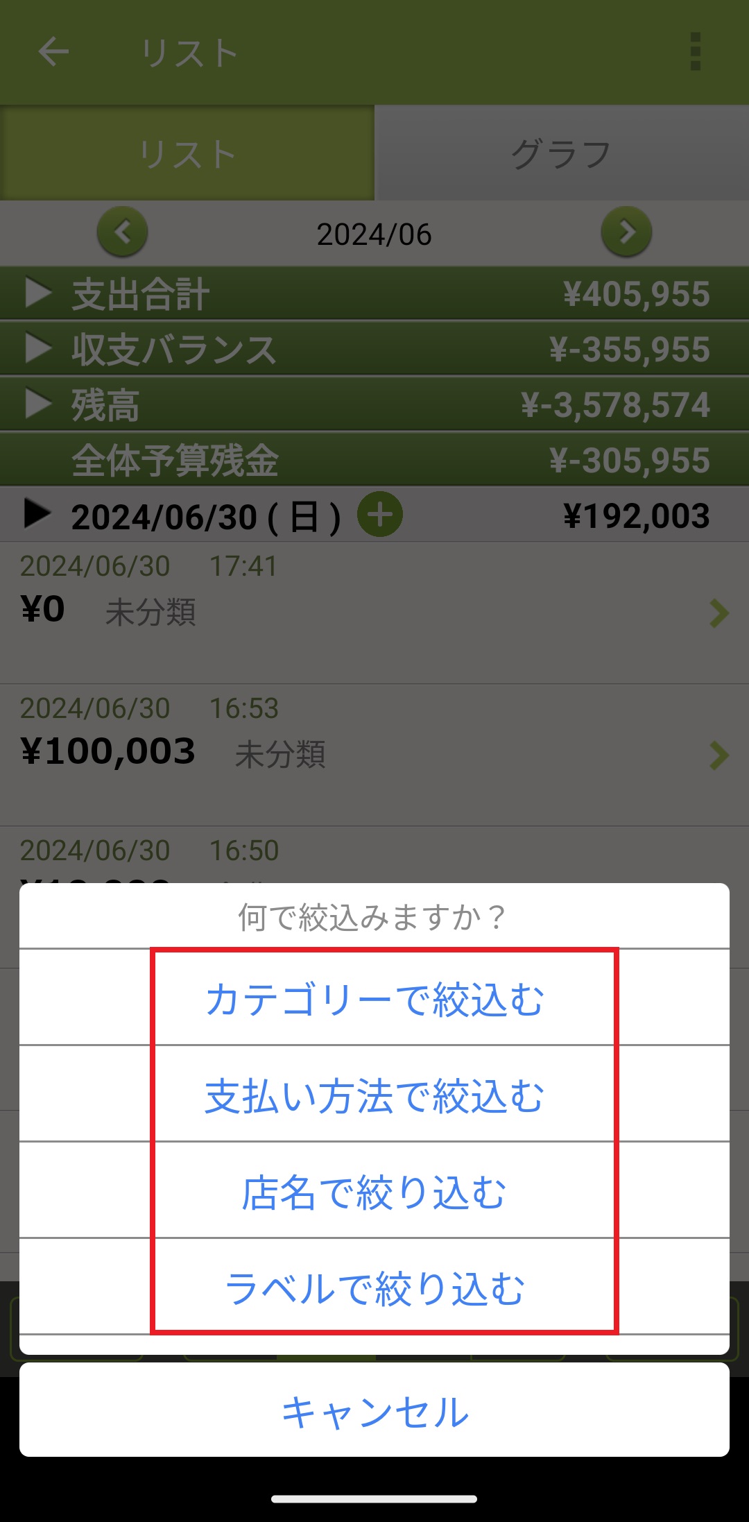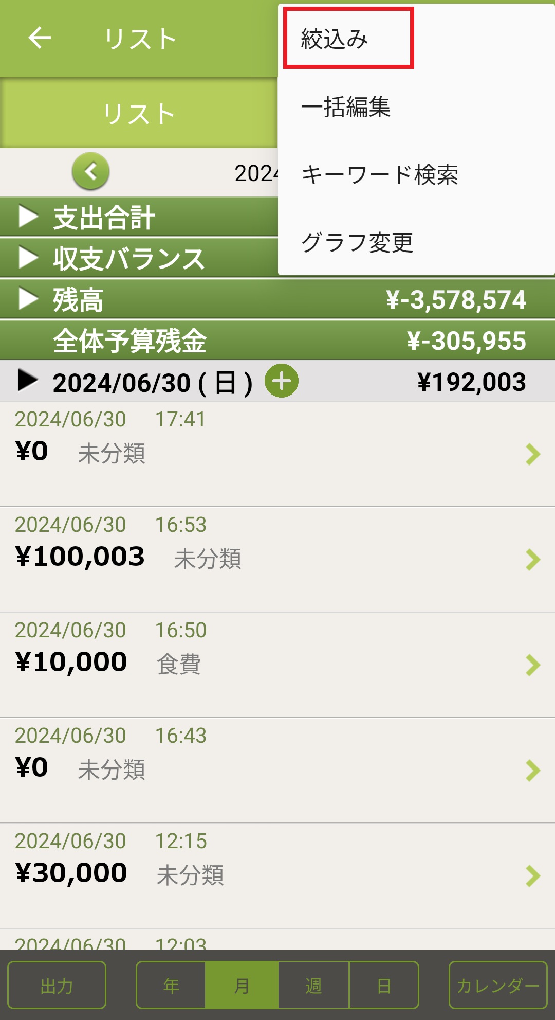 項目別に絞込んでデータを見る方法 Android版 2024/08/20 1.ホーム画面の下にある「リスト」のアイコンを押します。 2.右上にある「:」のボタンを押します。 3.「絞込み」ボタンを押します。 4.絞り込みたい項目を選択します。 5.絞り込みたいカテゴリーを選択して、左上の矢印ボタンを押します。(今回は「カテゴリーで絞り込み」を選択しています。) 6.カテゴリーを絞り込むことができます。 ※設定の「集計/記録情報設定」にある各項目を設定ONにしてから「絞り込む」機能をご利用ください。