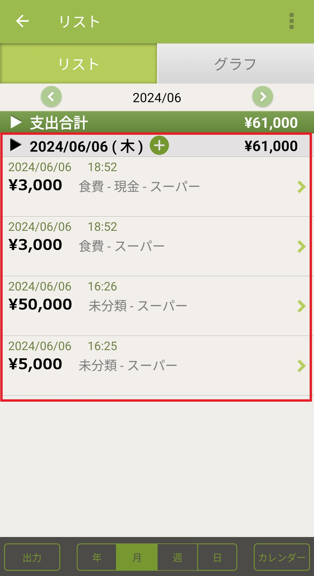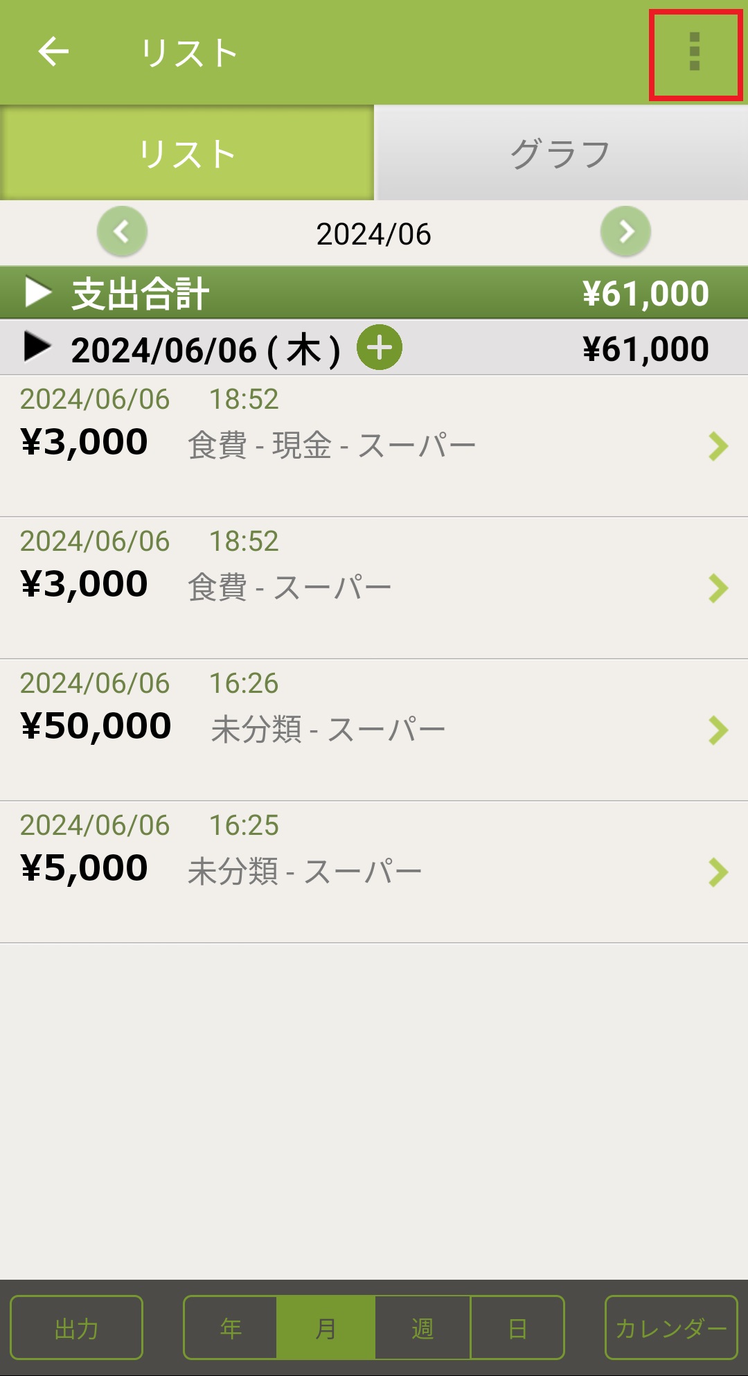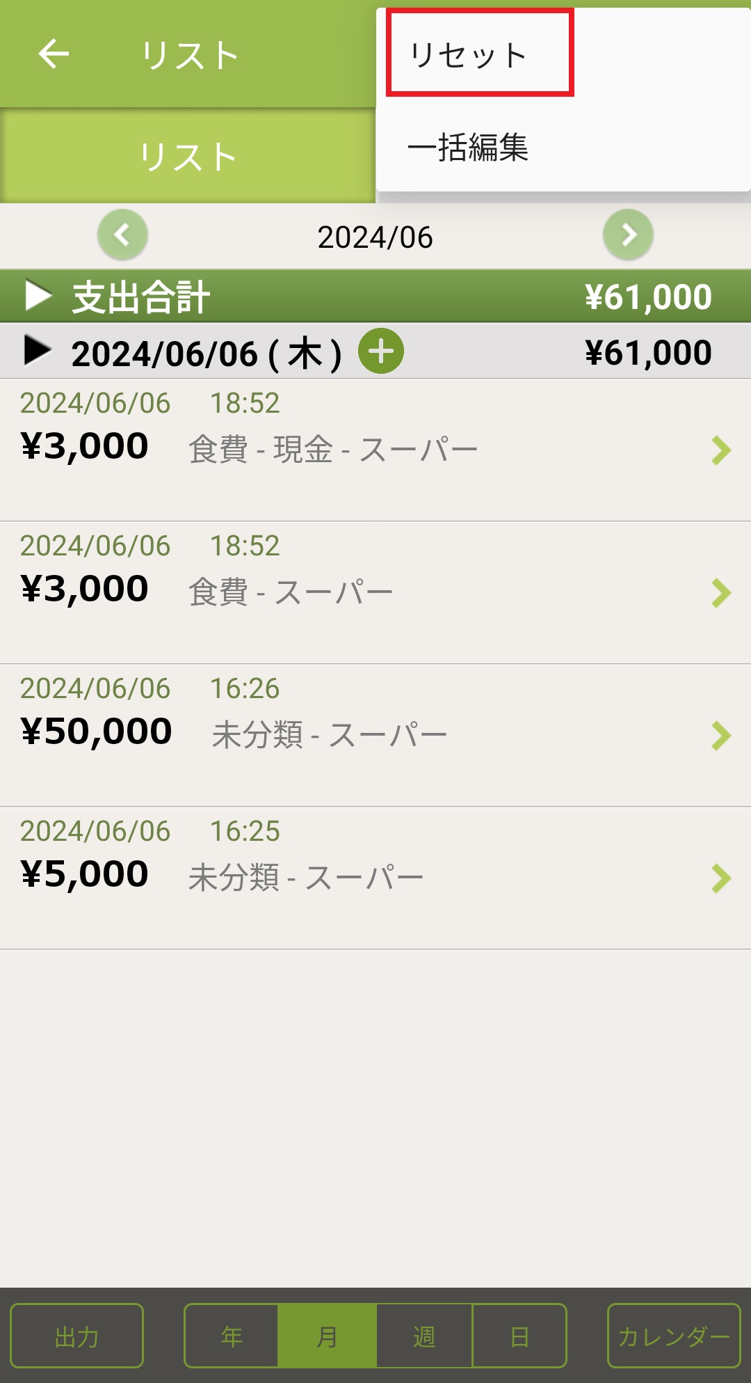 1. おカネレコ起動後、トップ画面左下の「リスト」を押します。