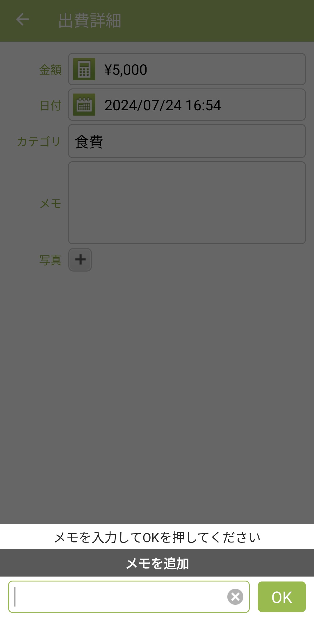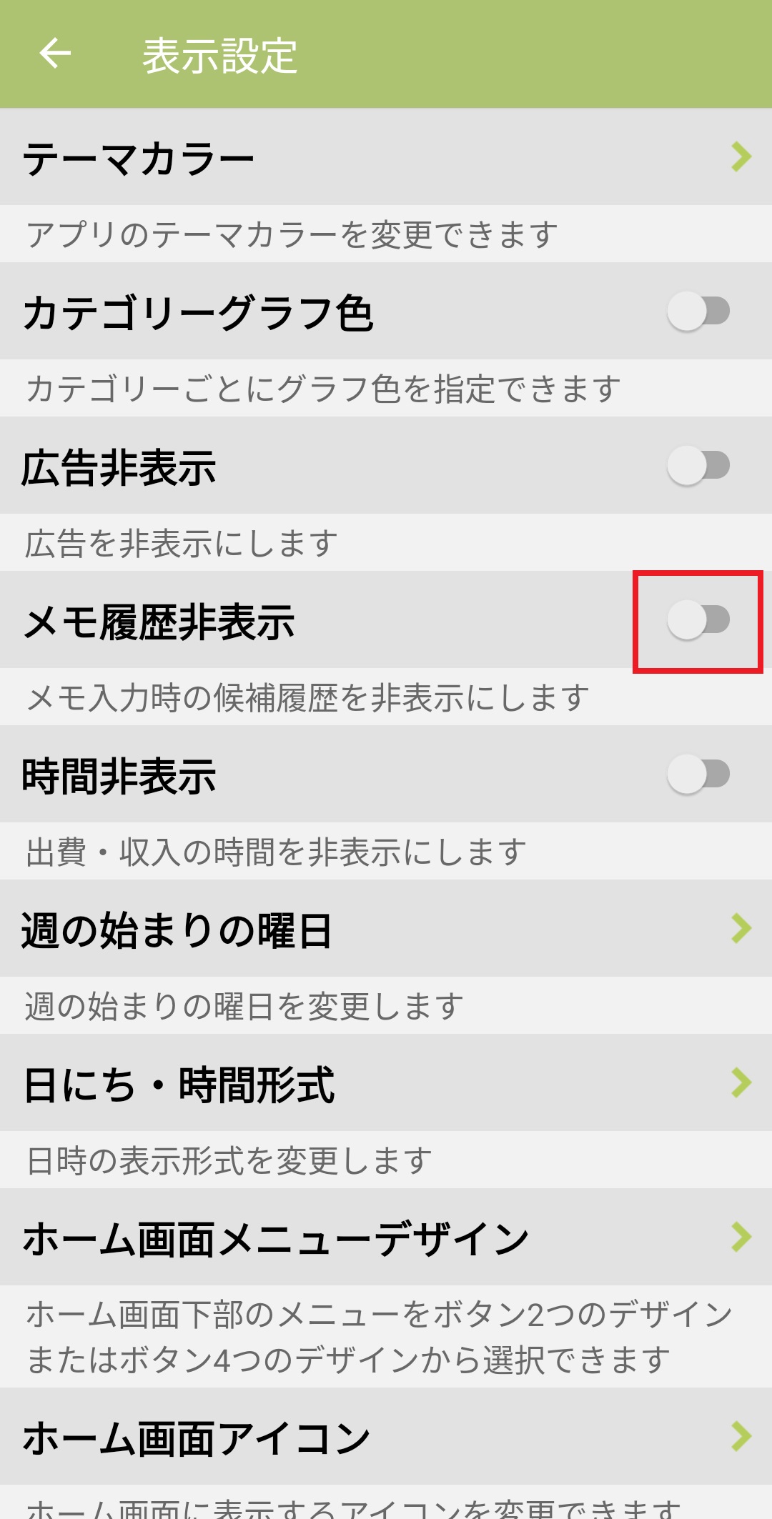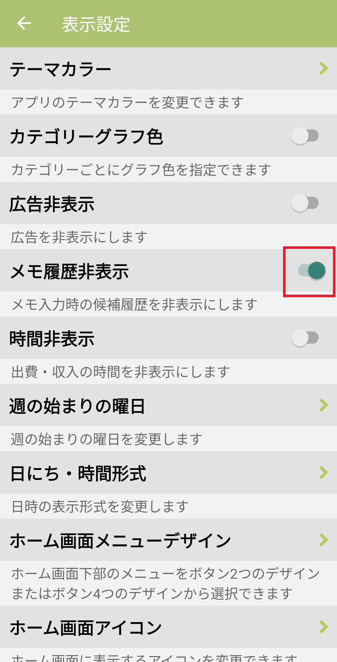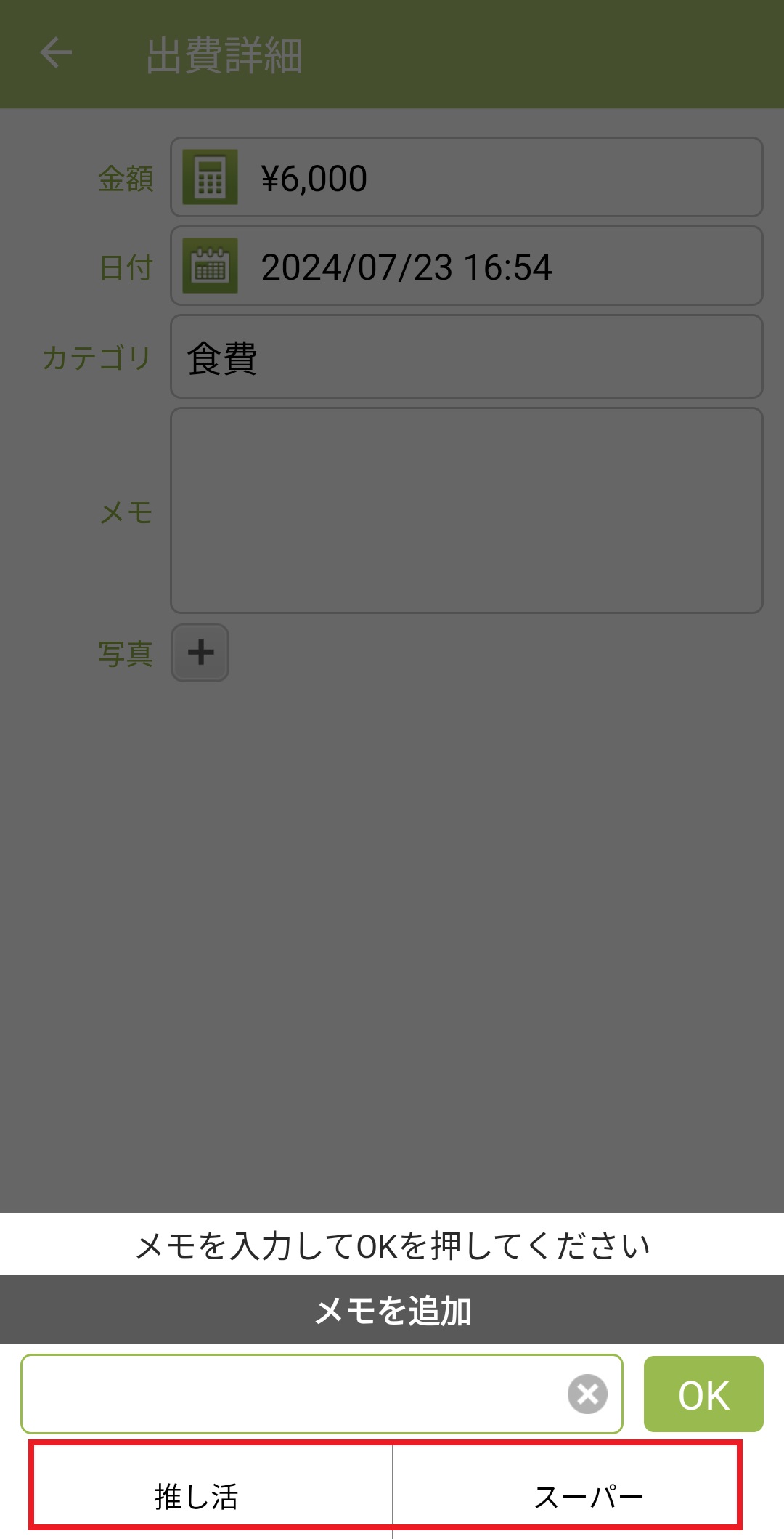 ※メモ履歴の内容は家計簿の過去にご入力いただいたメモの内容から表示しているため、候補として表示される特定のメモ内容を削除することはできません。過去の出費・収入のメモ欄自体を削除すると候補にも表示されなくなります。