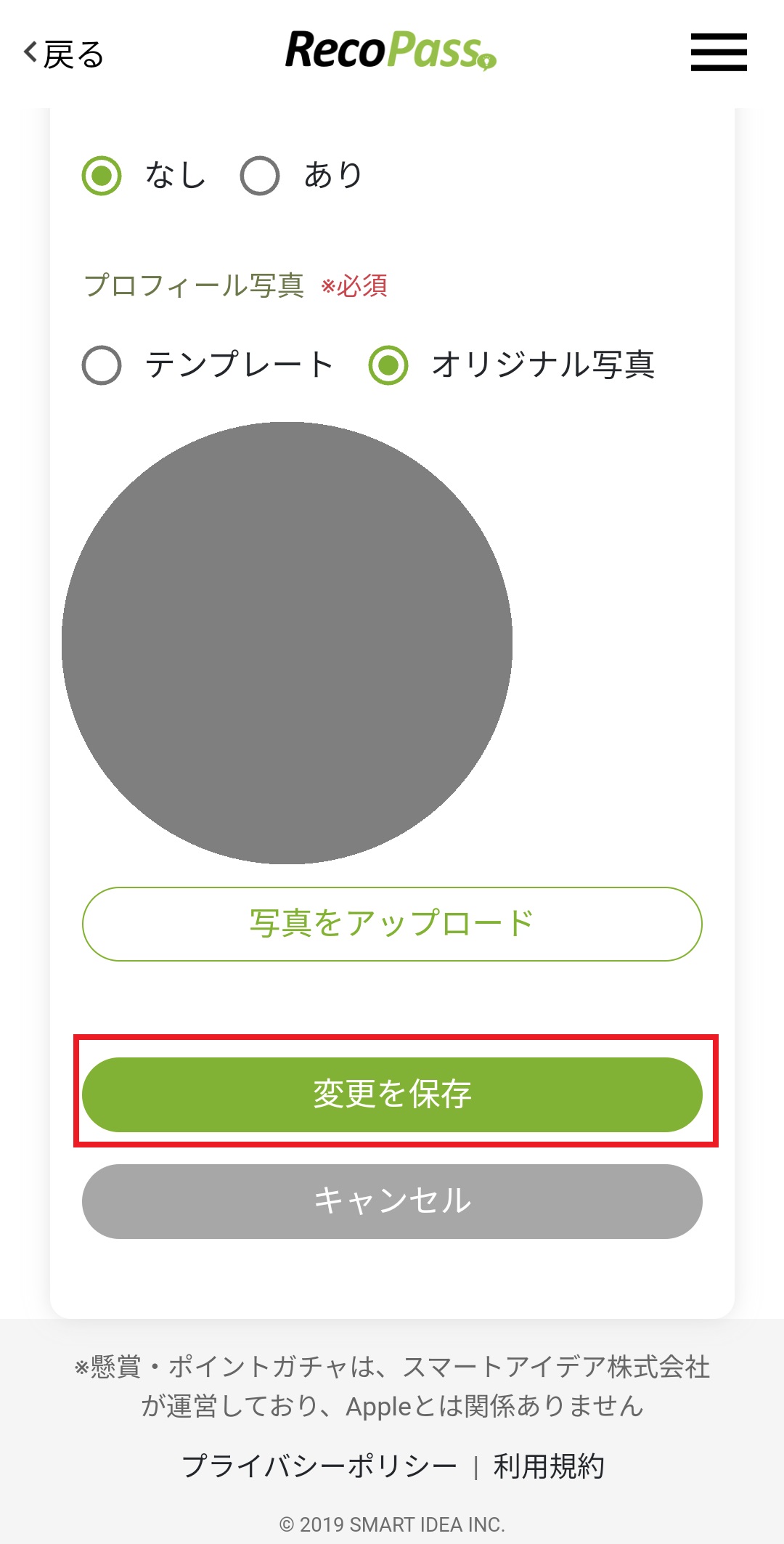 3.プロフィール画像(画面中央の丸い画像)の右横に表示されている「レコパス設定」を押します。