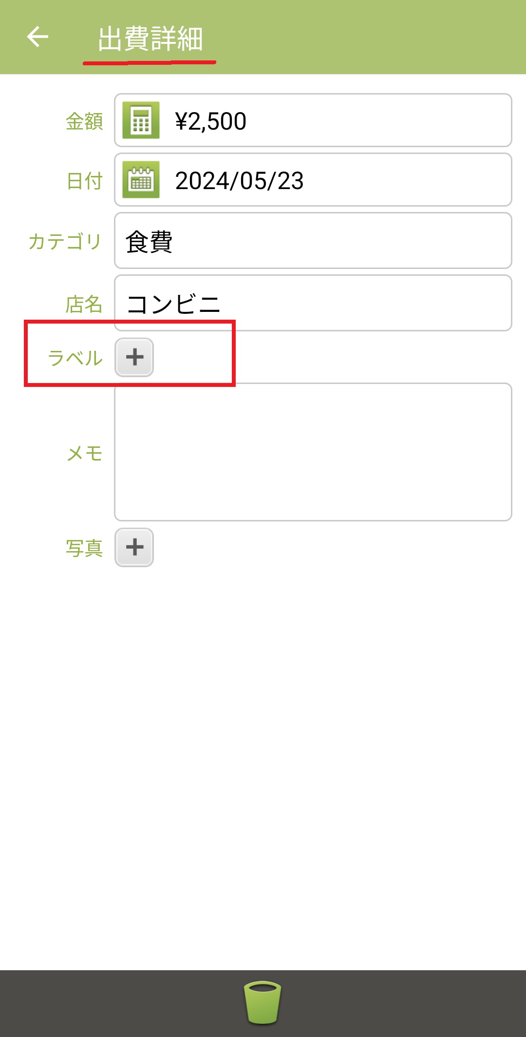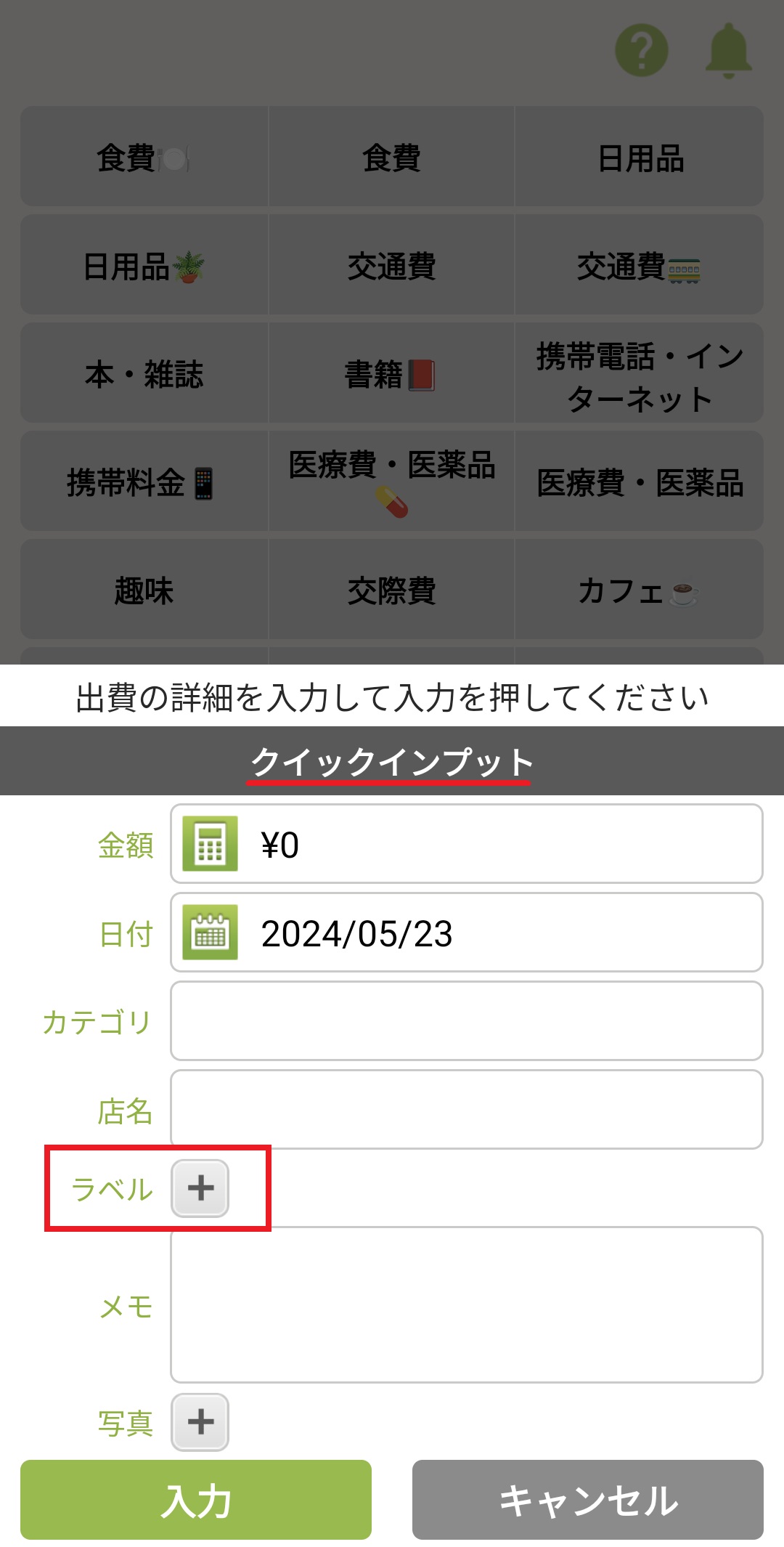 4.「ラベル」が”オン”の状態で「ラベルを毎回記録する」が”オフ”の状態の時、出費詳細やクイックインプットパネルなどからラベルをつけることができます。