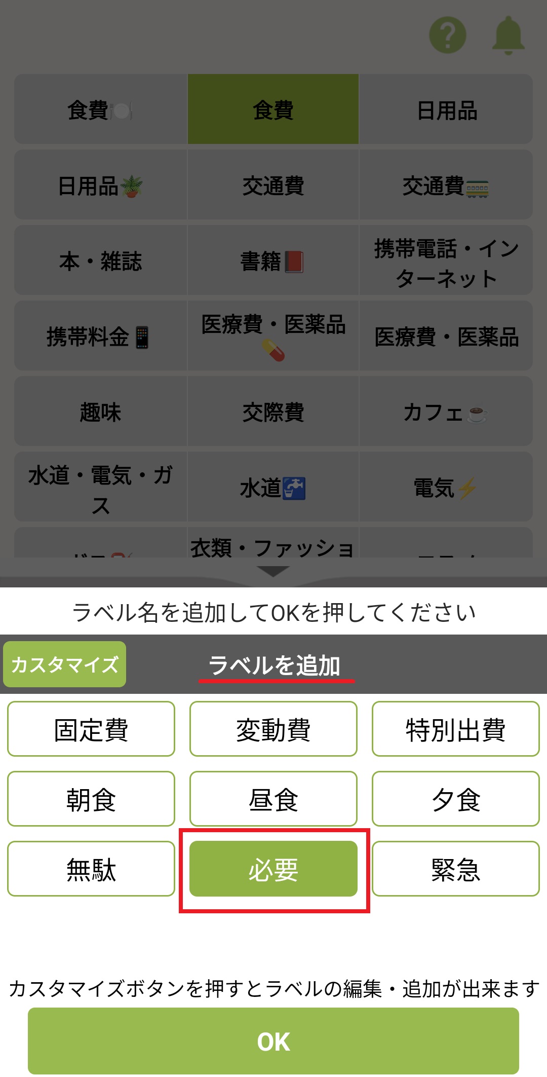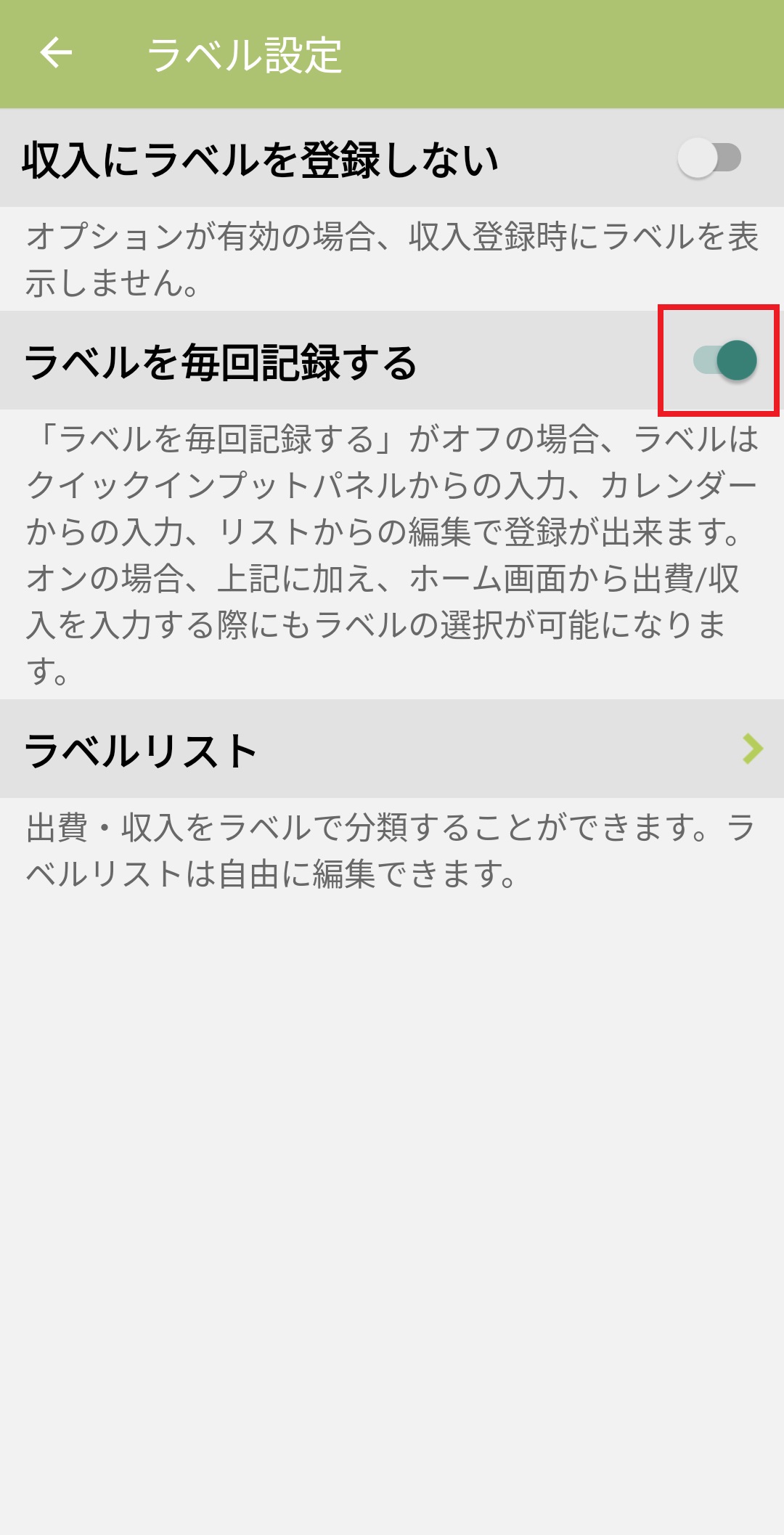 ※「ラベルを毎回記録する」をオンにした場合、ホーム画面でカテゴリー選択→金額入力→「入力」ボタンを押した後に、ラベル選択画面が表示され、毎回ラベルの選択が可能になります。
