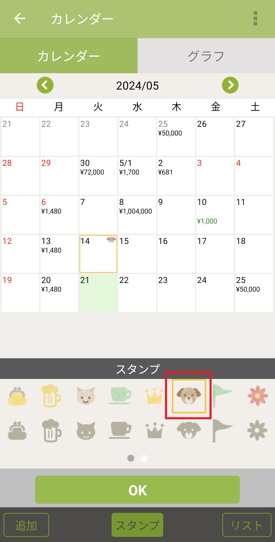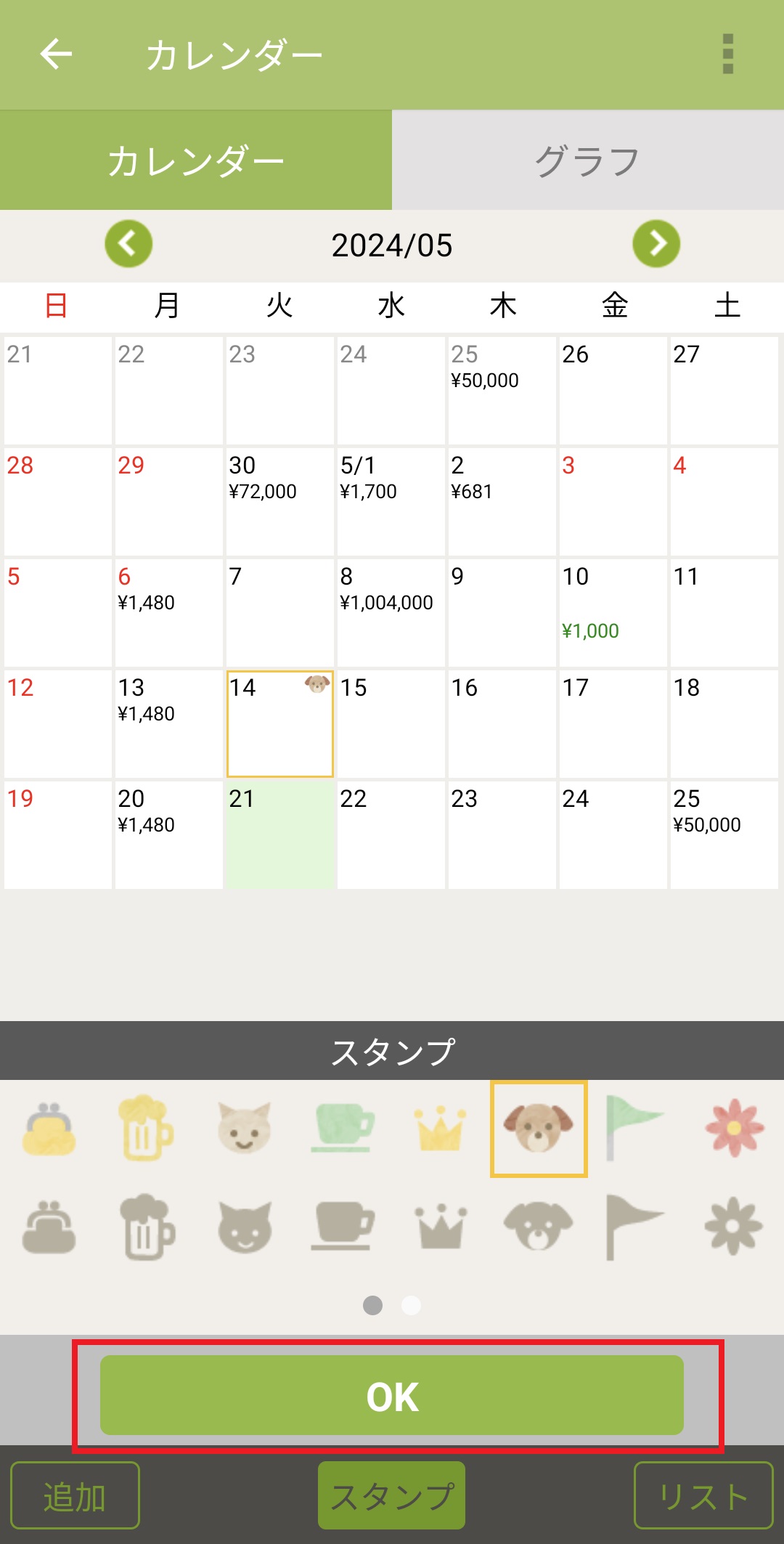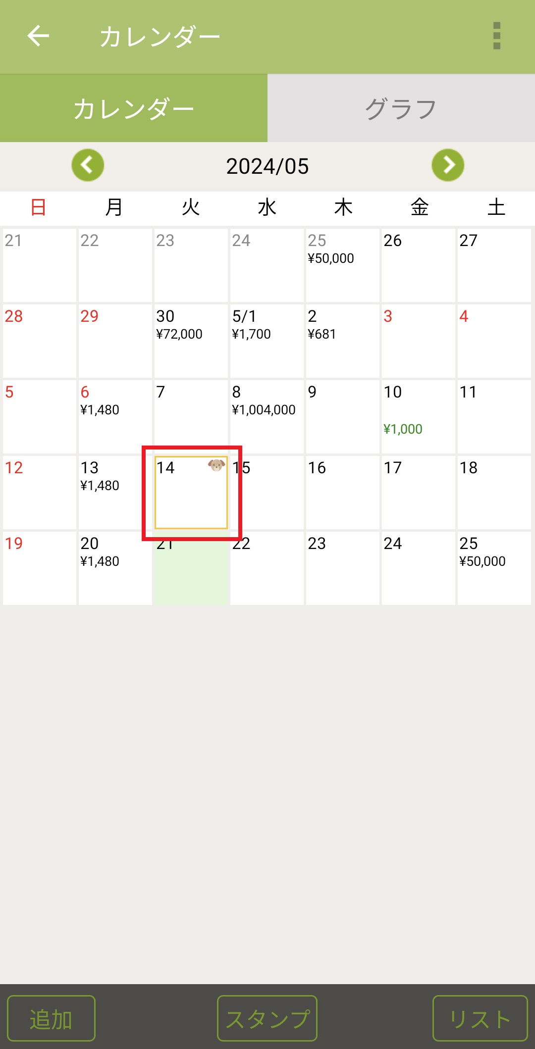 3.選択した日にオレンジ色の枠がつきます。下段中央の「スタンプ」を押します。