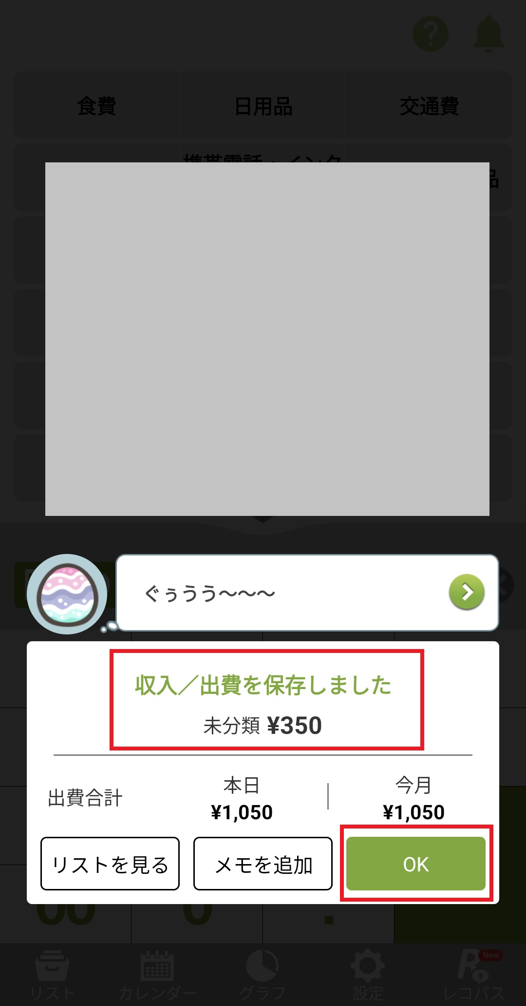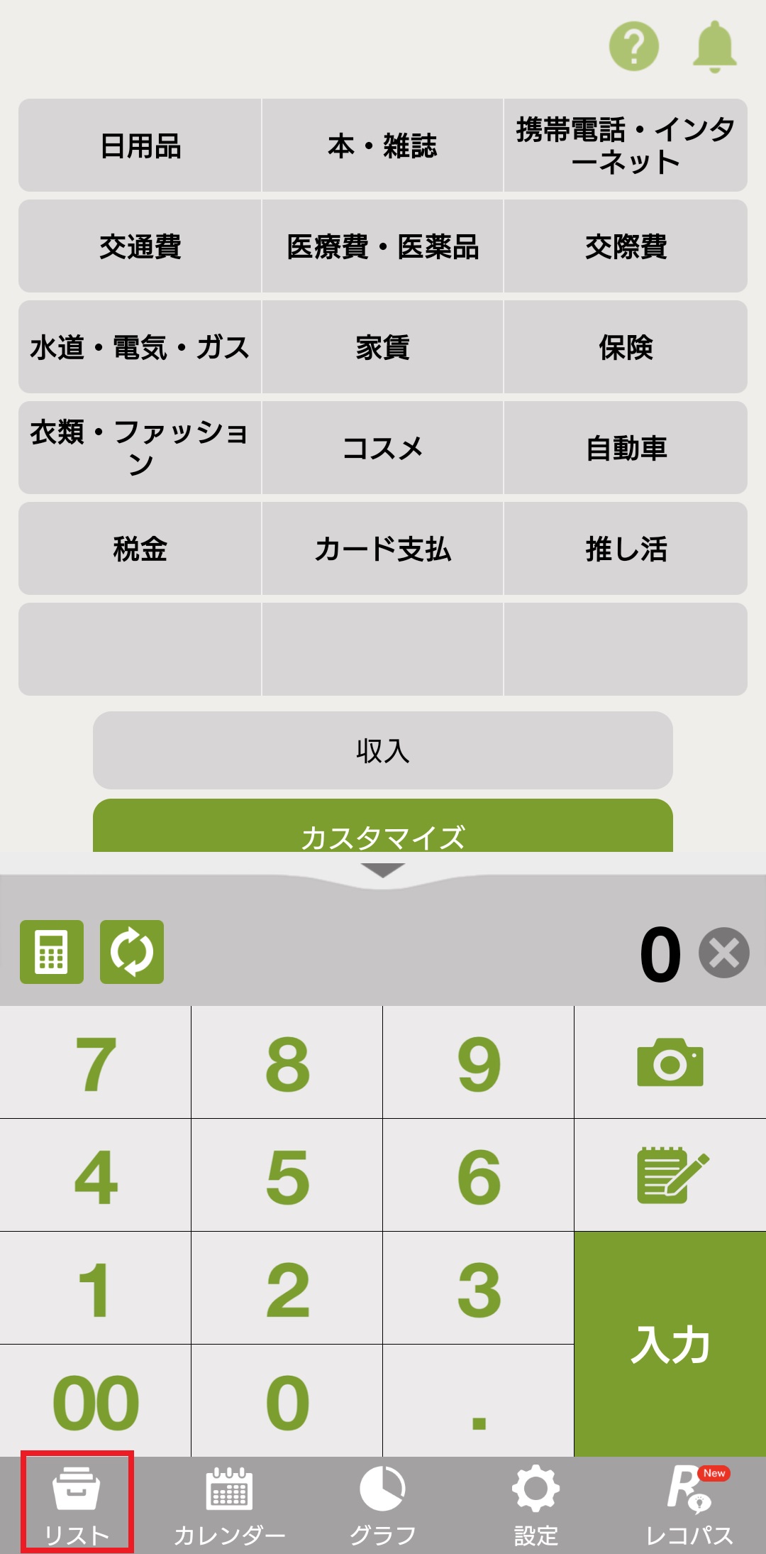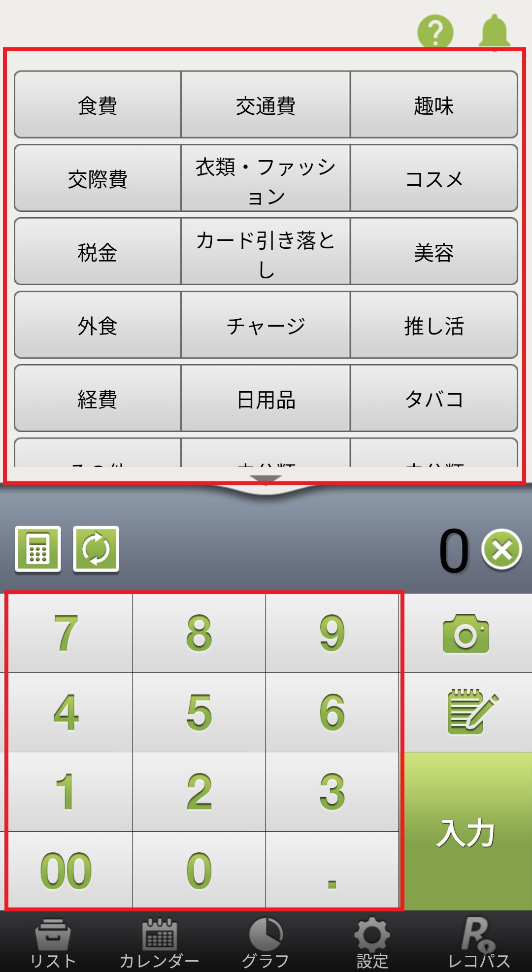 1.アプリ起動後、入力画面が表示されます。入力画面上部でカテゴリーを選択し、下部の数字のキーで金額を入力します。