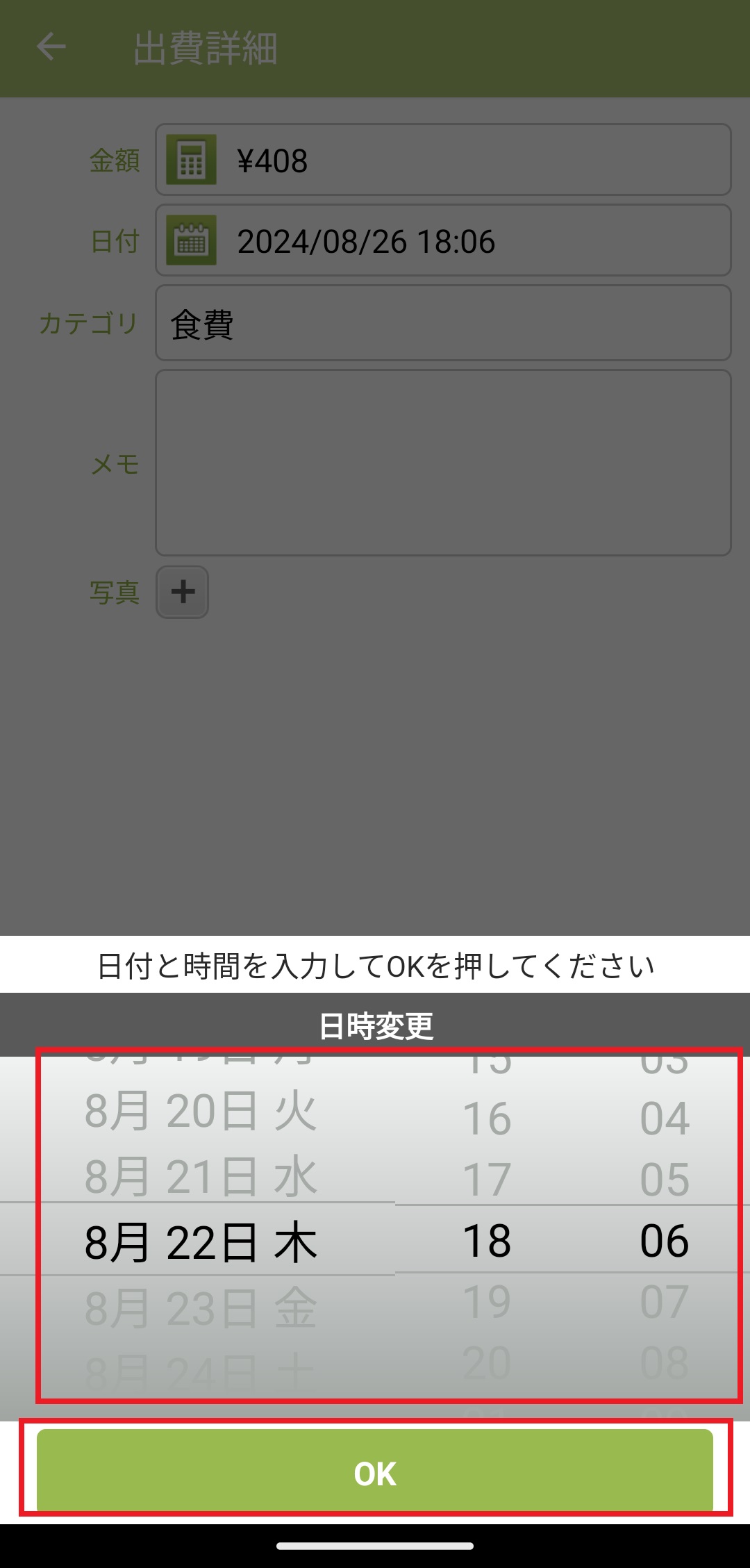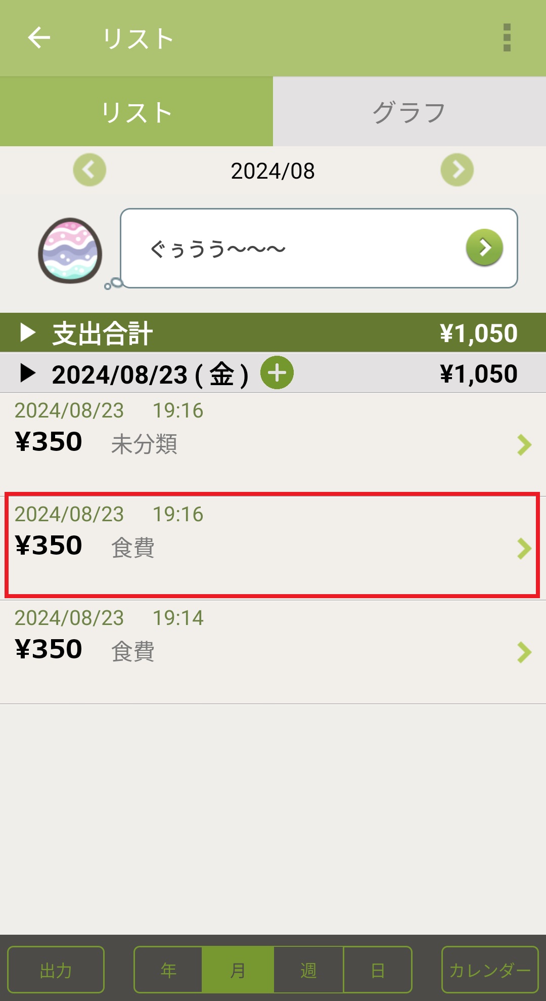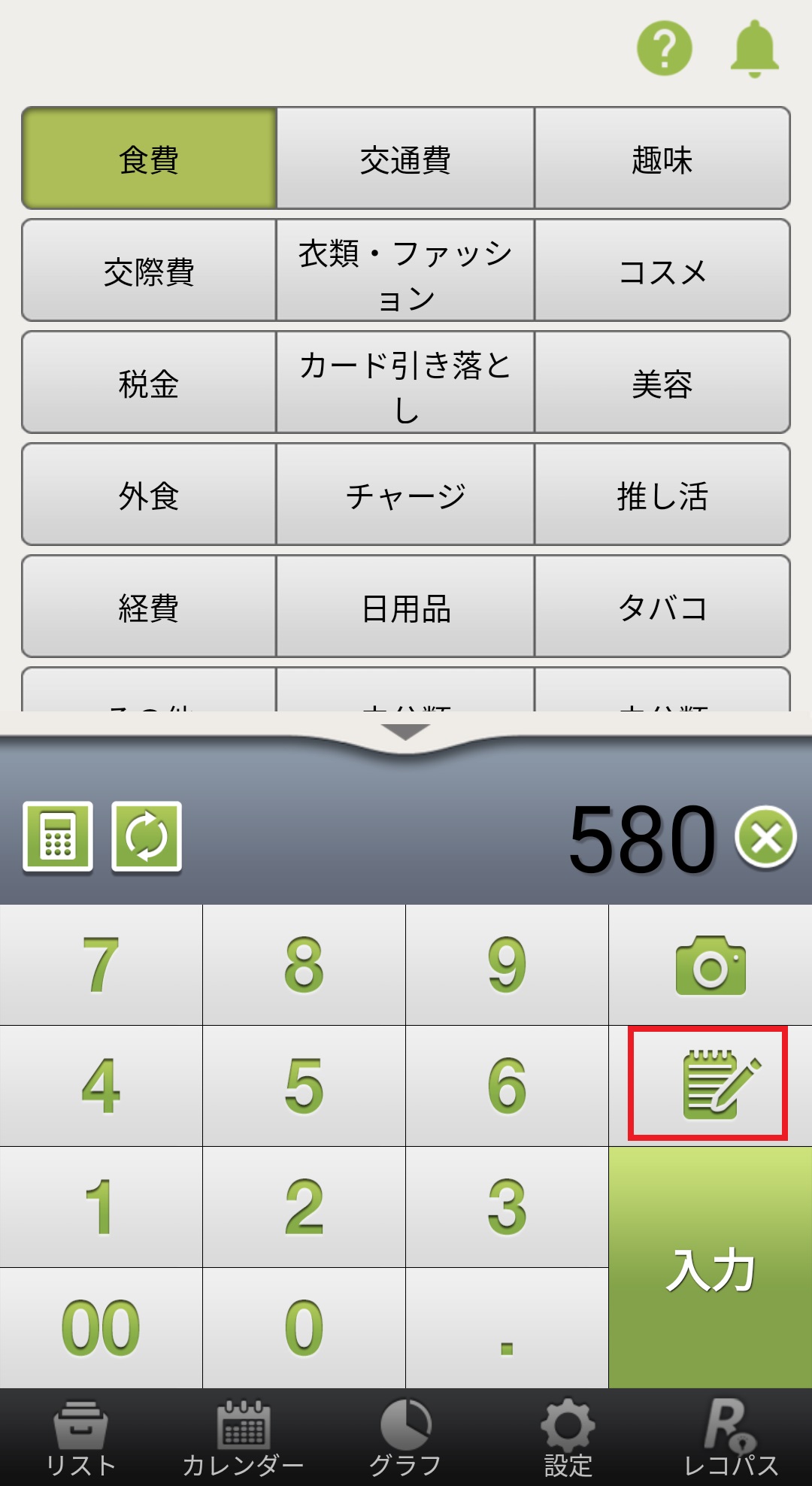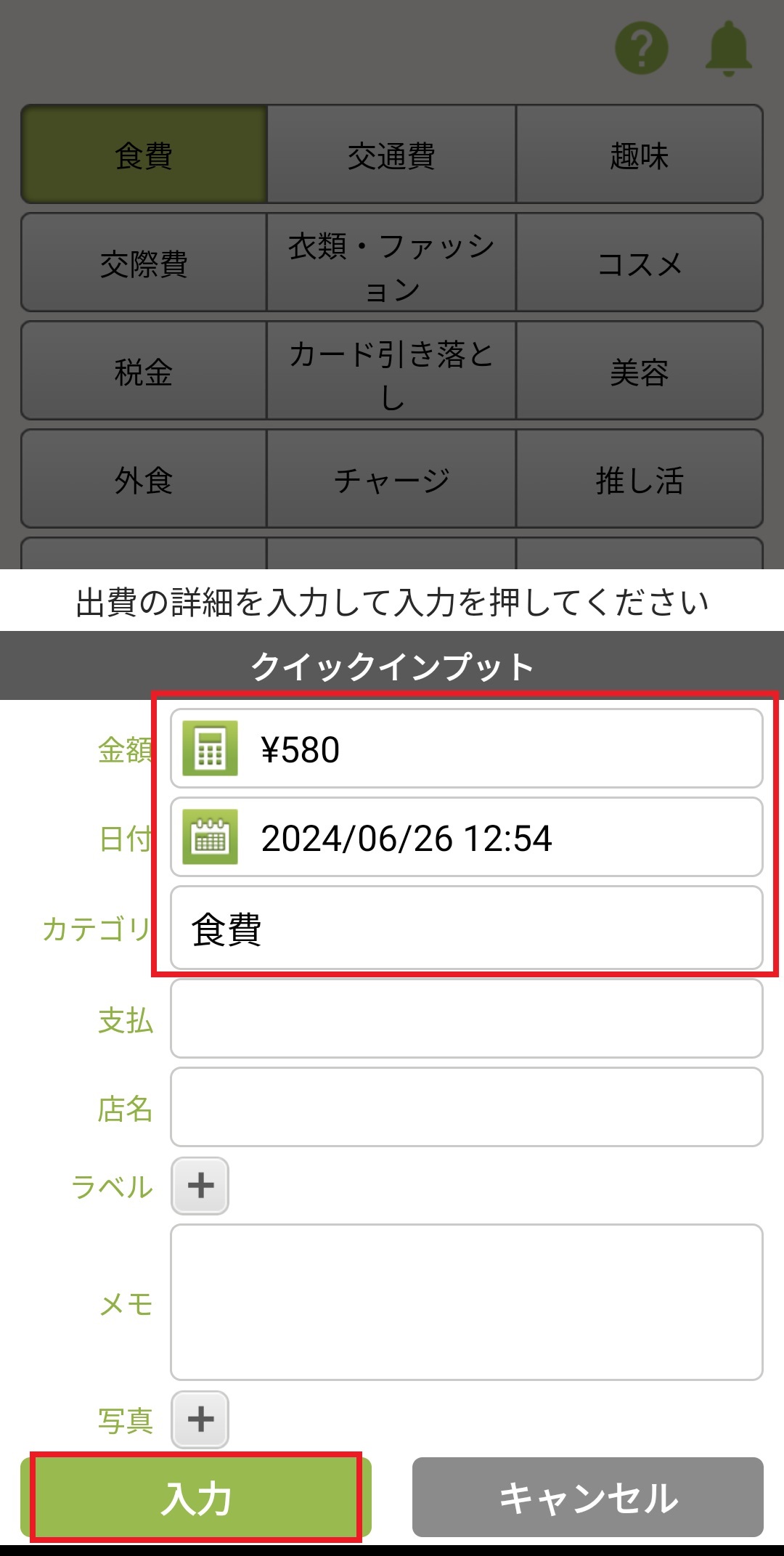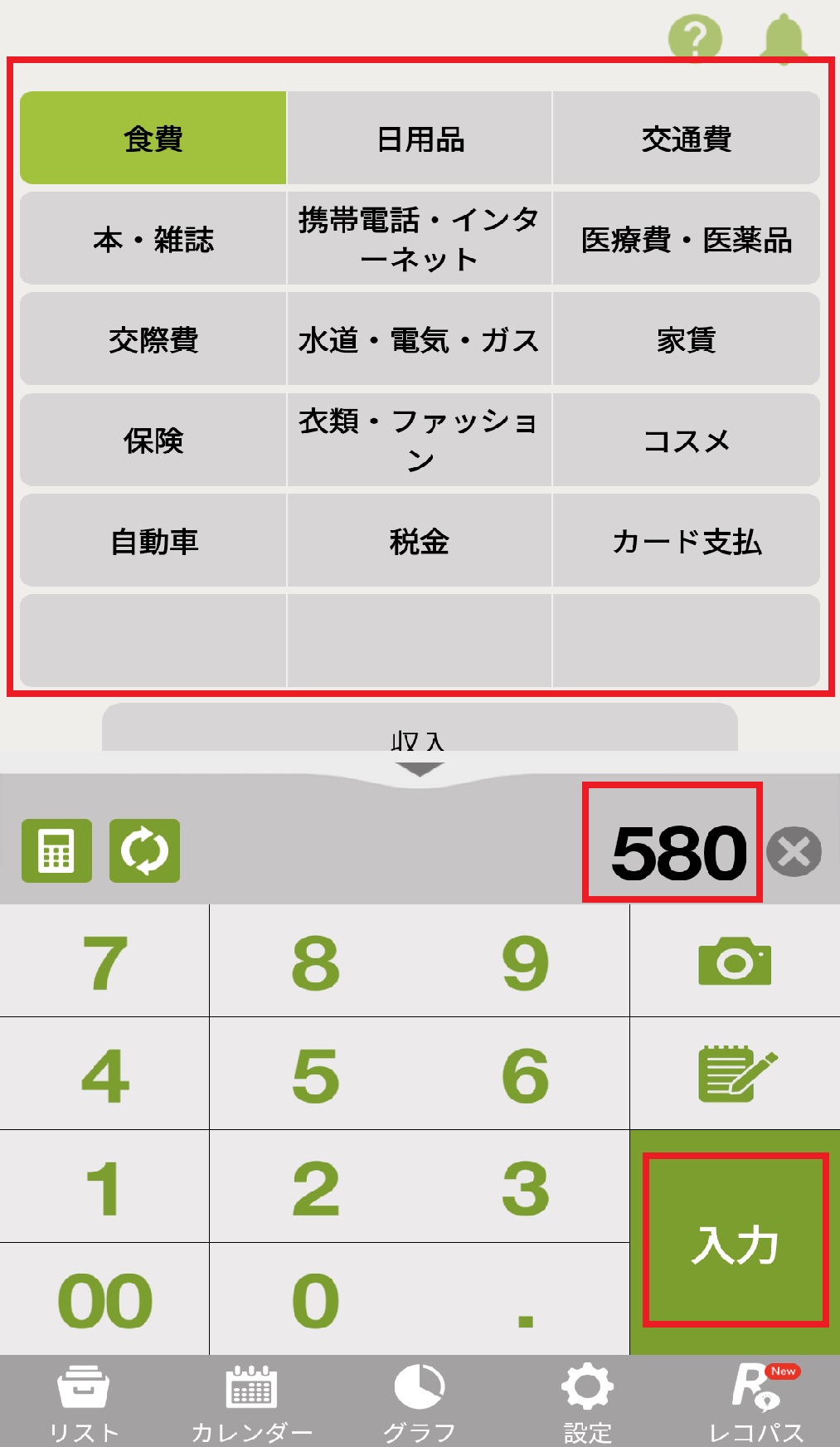 2.カテゴリーと金額を入力しましたら、「入力」ボタンを押します。