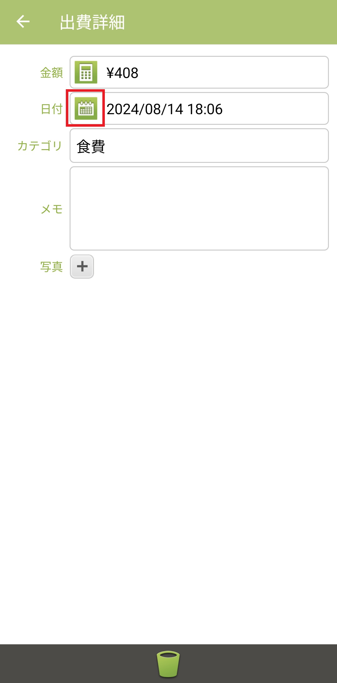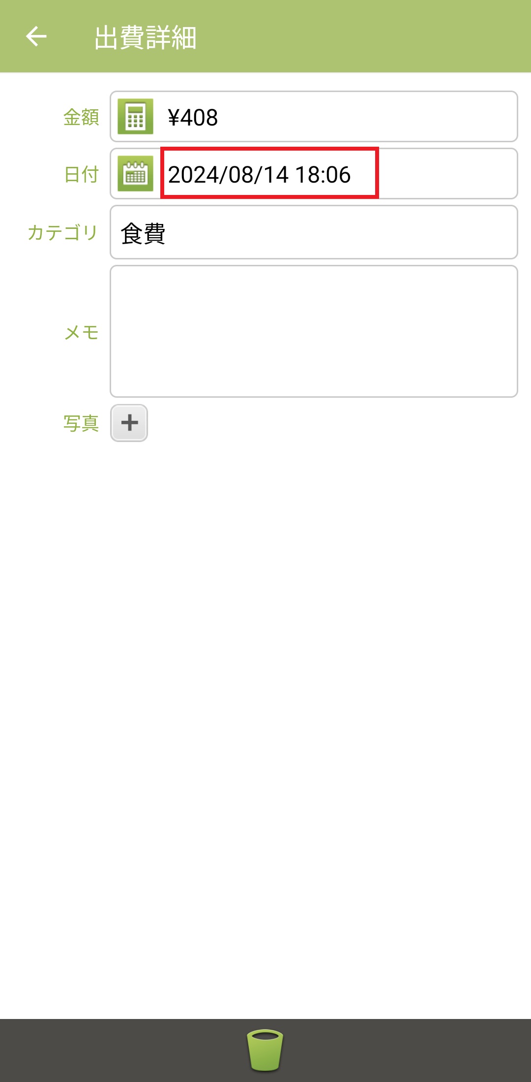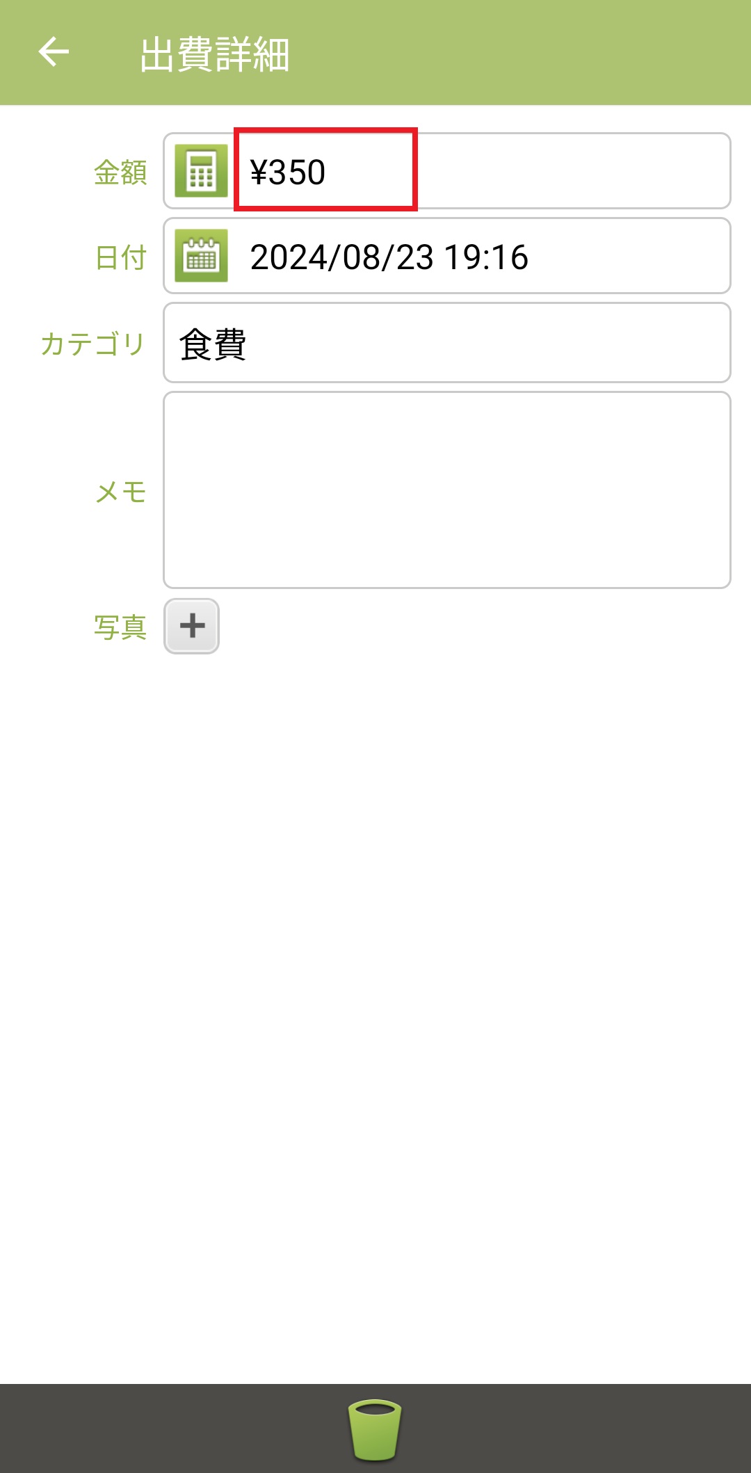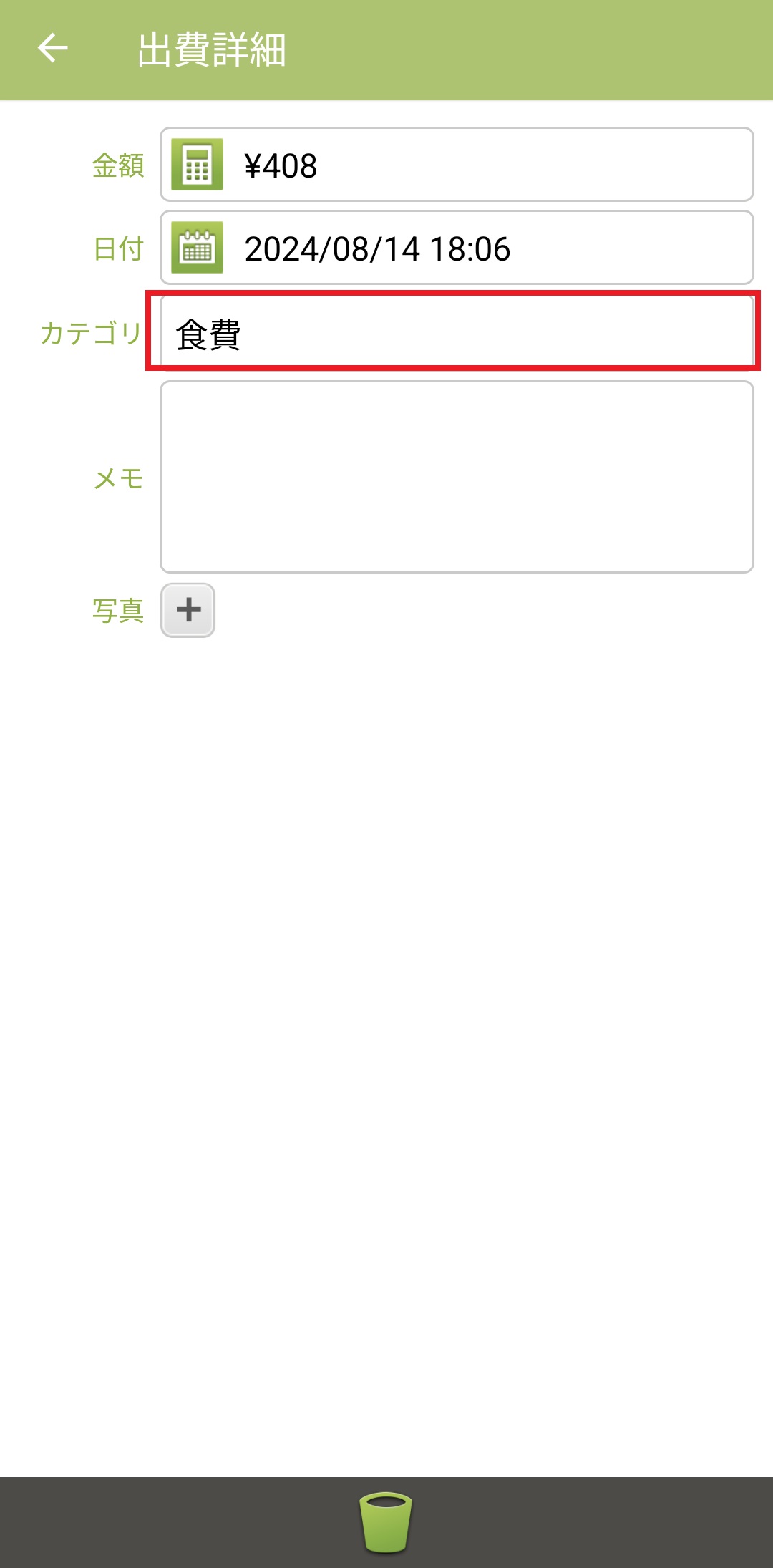 ※デフォルトでは、「カテゴリー、金額、メモ」が設定されています。その他に「支払方法、店名、ラベル」を入力時に登録できます。入力項目の設定はおカネレコの「設定」にて変更できます。