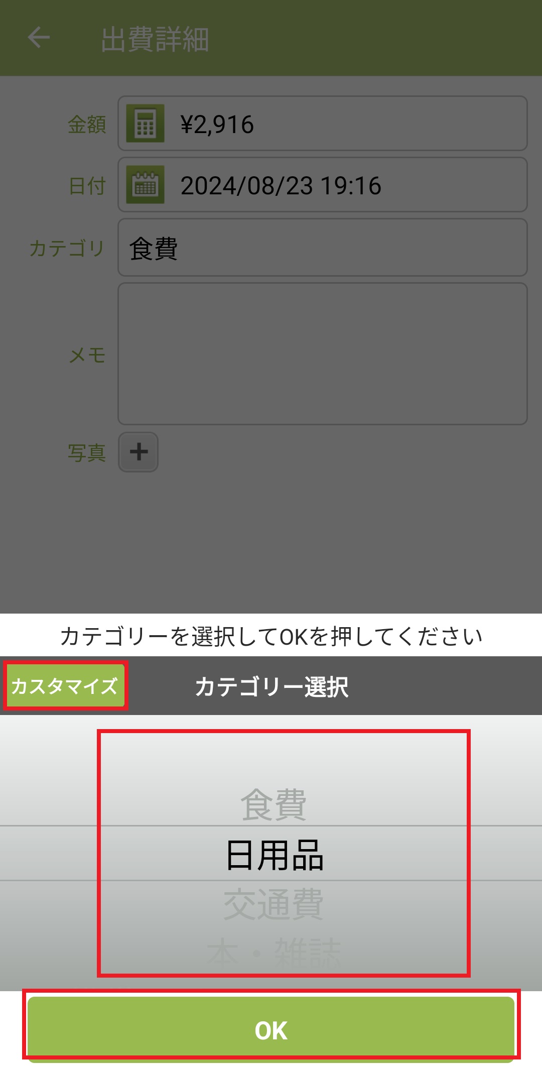 ※カテゴリー選択画面左上の「カスタマイズ」を押していただくとカテゴリー自体の編集が可能です。