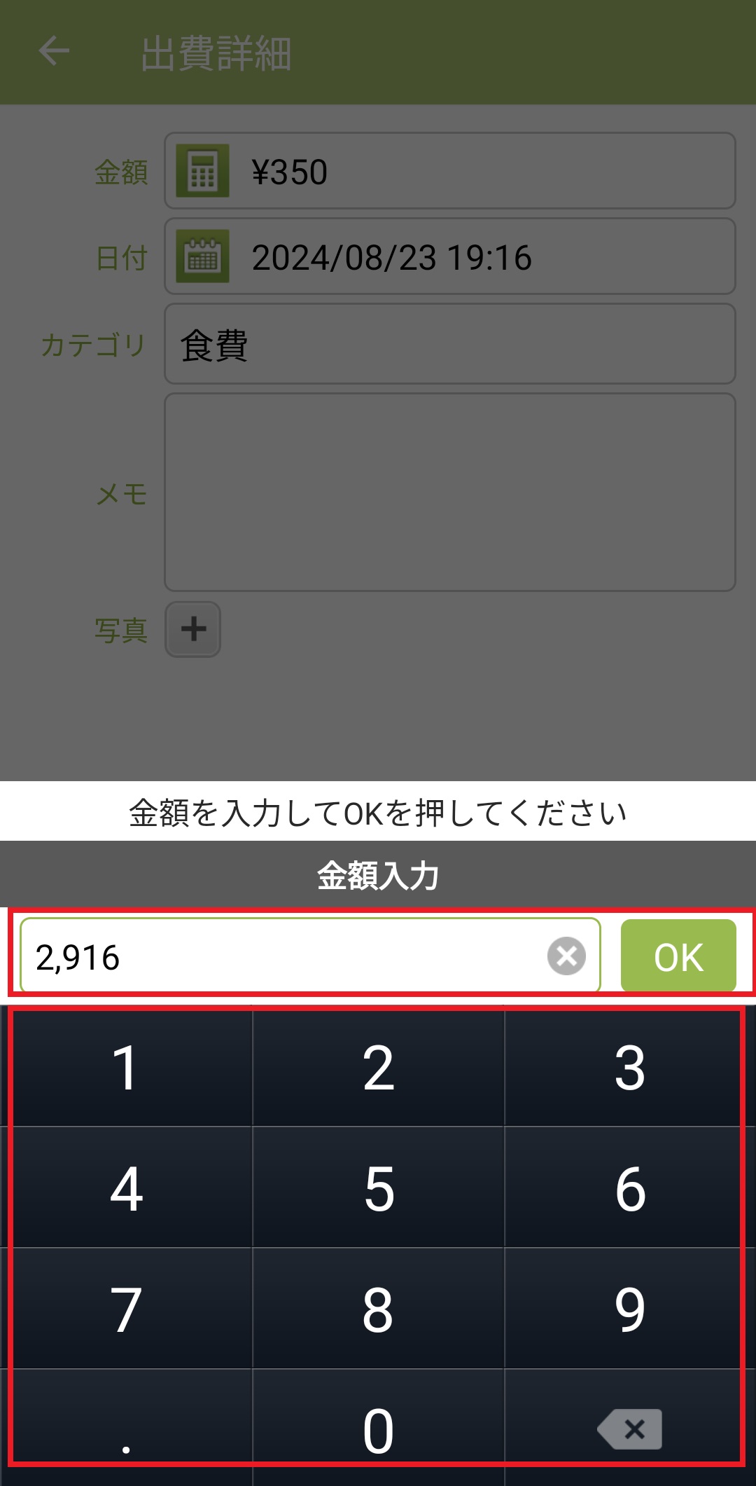 2.金額の変更は金額欄の数字部分を押すと画像のようにキー画面が表示されます。