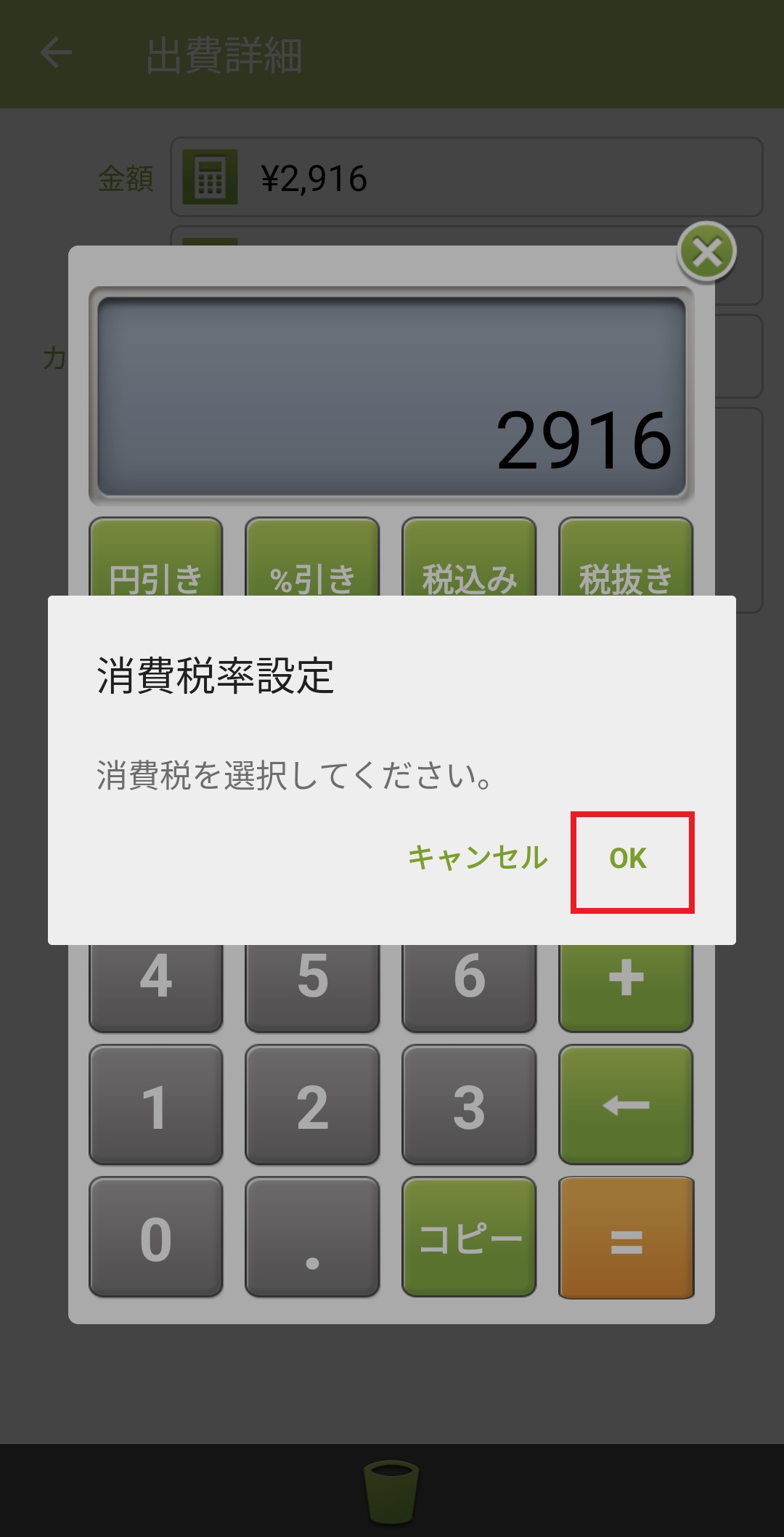4.電卓を初めて利用される場合は消費税率の設定と端数処理の設定を行います。初めに税率設定を行います。「OK」を押します。