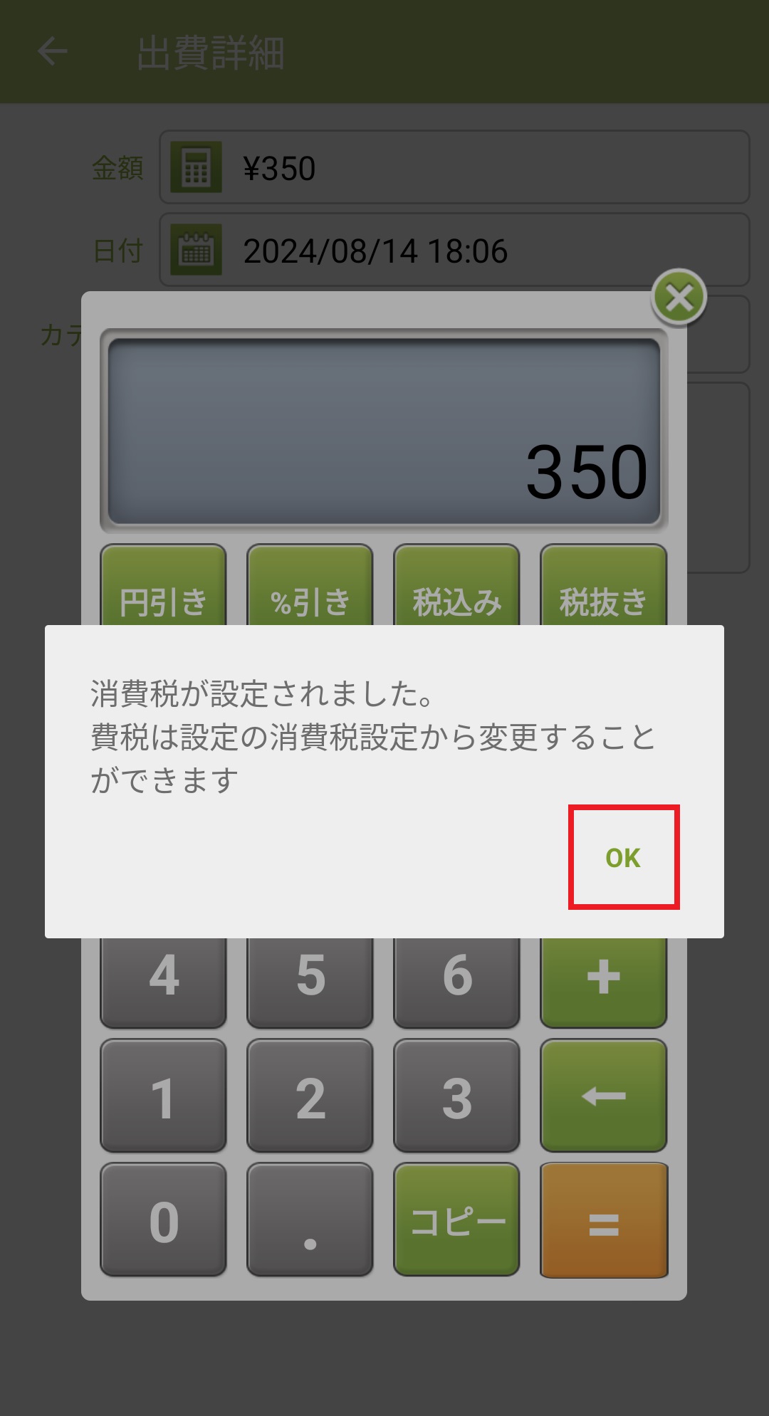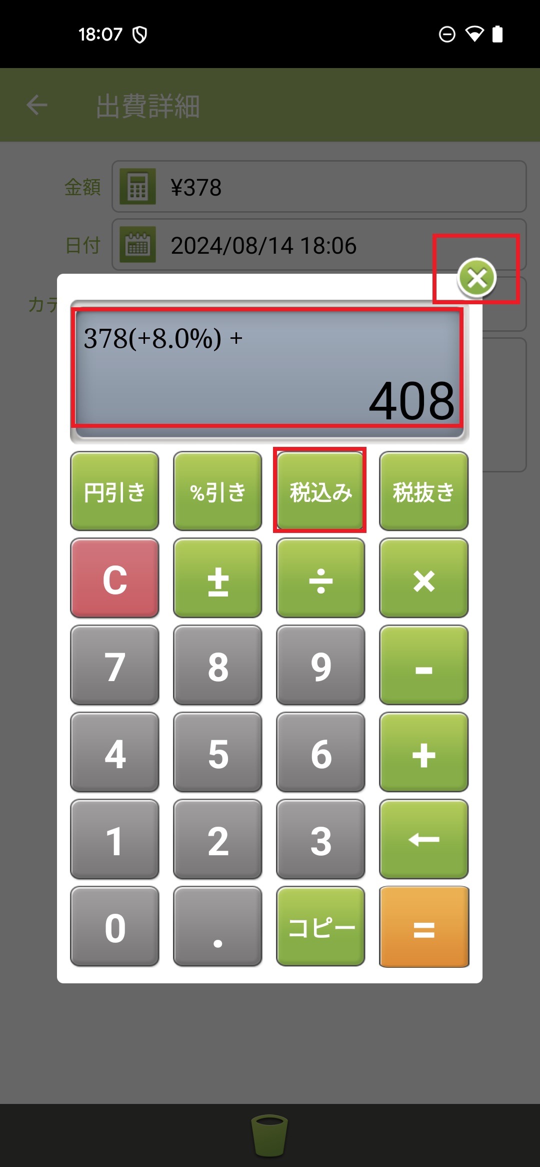 8.電卓の「税込み」ボタンを押していただくと、設定いただいた消費税率が反映され、画像のように表示されます。計算が完了したら電卓画面右上の×ボタンを押します。