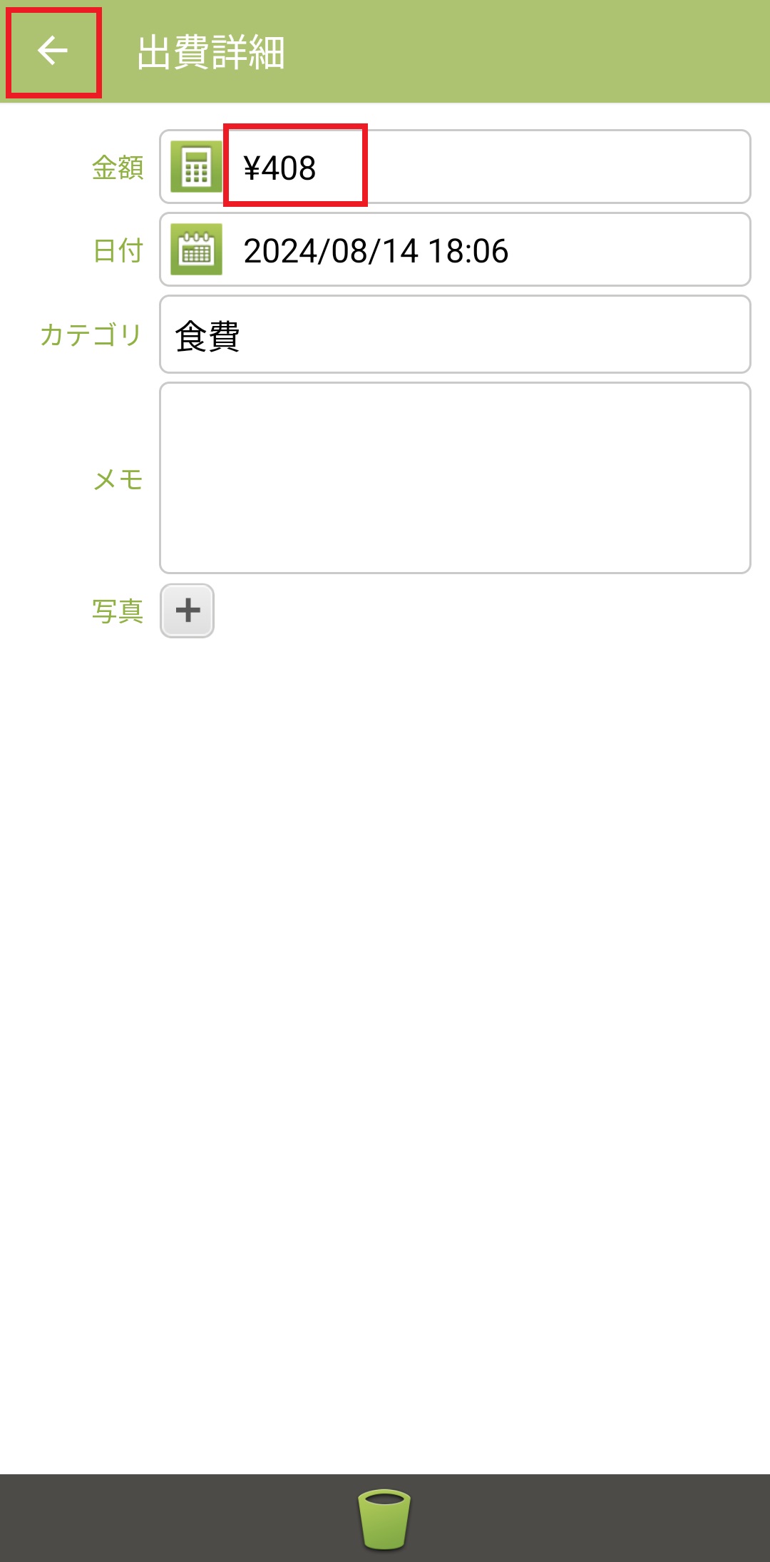 10.金額欄に電卓計算後の金額が反映されます。※修正が完了しましたら、詳細画面左上の「←」を押します。