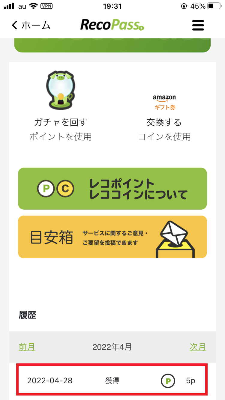 4.レコパスに戻ると、画面下部のポイント・コイン履歴に獲得したコイン数(1コイン)が表示されますのでご確認ください。